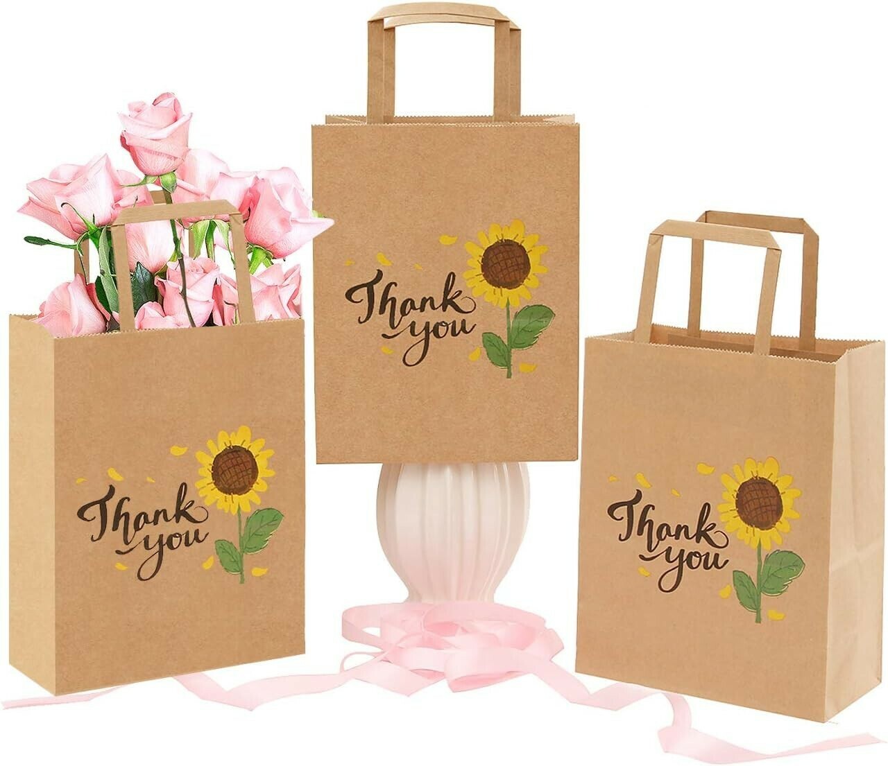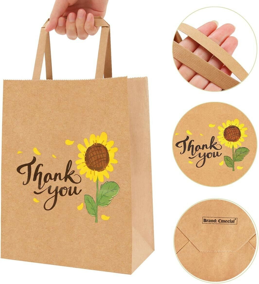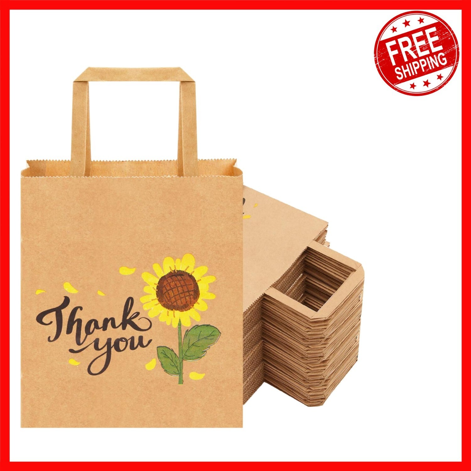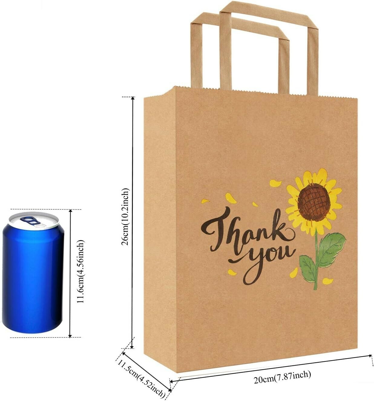Discover the perfect blend of durability and eco-friendliness with our reusable sunflower-themed gift bags. Crafted from sturdy 120 gsm brown kraft paper, these small, stylish bags feature comfortable flat handles for easy carrying. Each bag displays a charming "Thank You" message on both sides, making them ideal for weddings, parties, small business packaging, or gift-giving occasions.