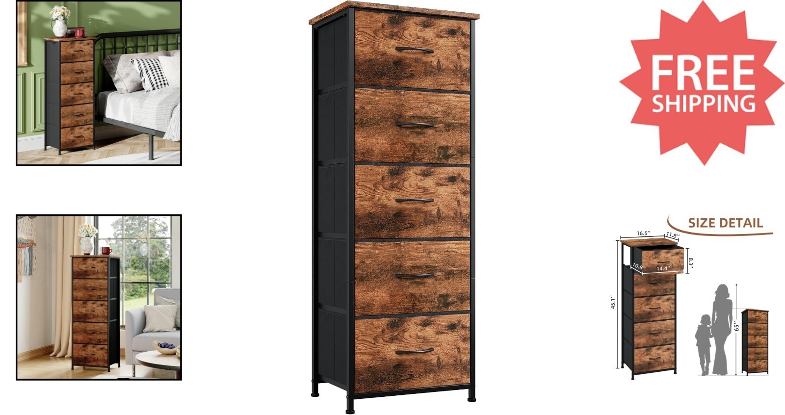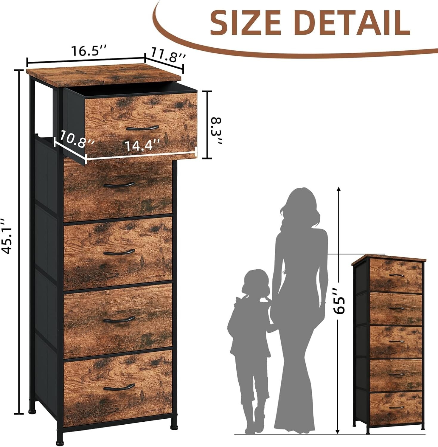 This tall dresser boasts an overall dimension of 16.5'' L x 11.8'' W x 45.1'' H with each drawer measuring 14.4'' W x 10.8'' D x 8.3'' H.