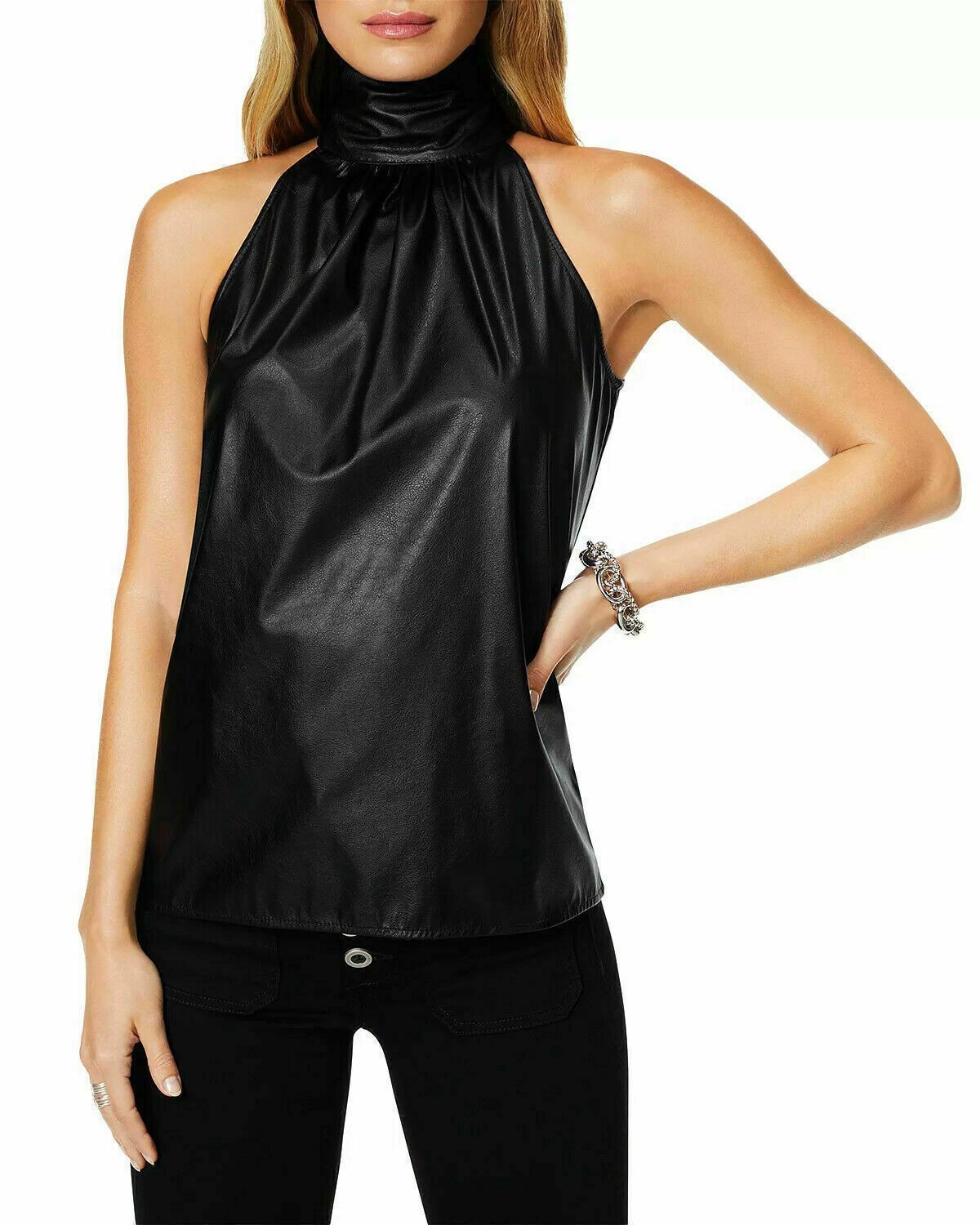 Elegante top de cuero de cordero suave genuino negro sin mangas para mujer fiesta informal\AS