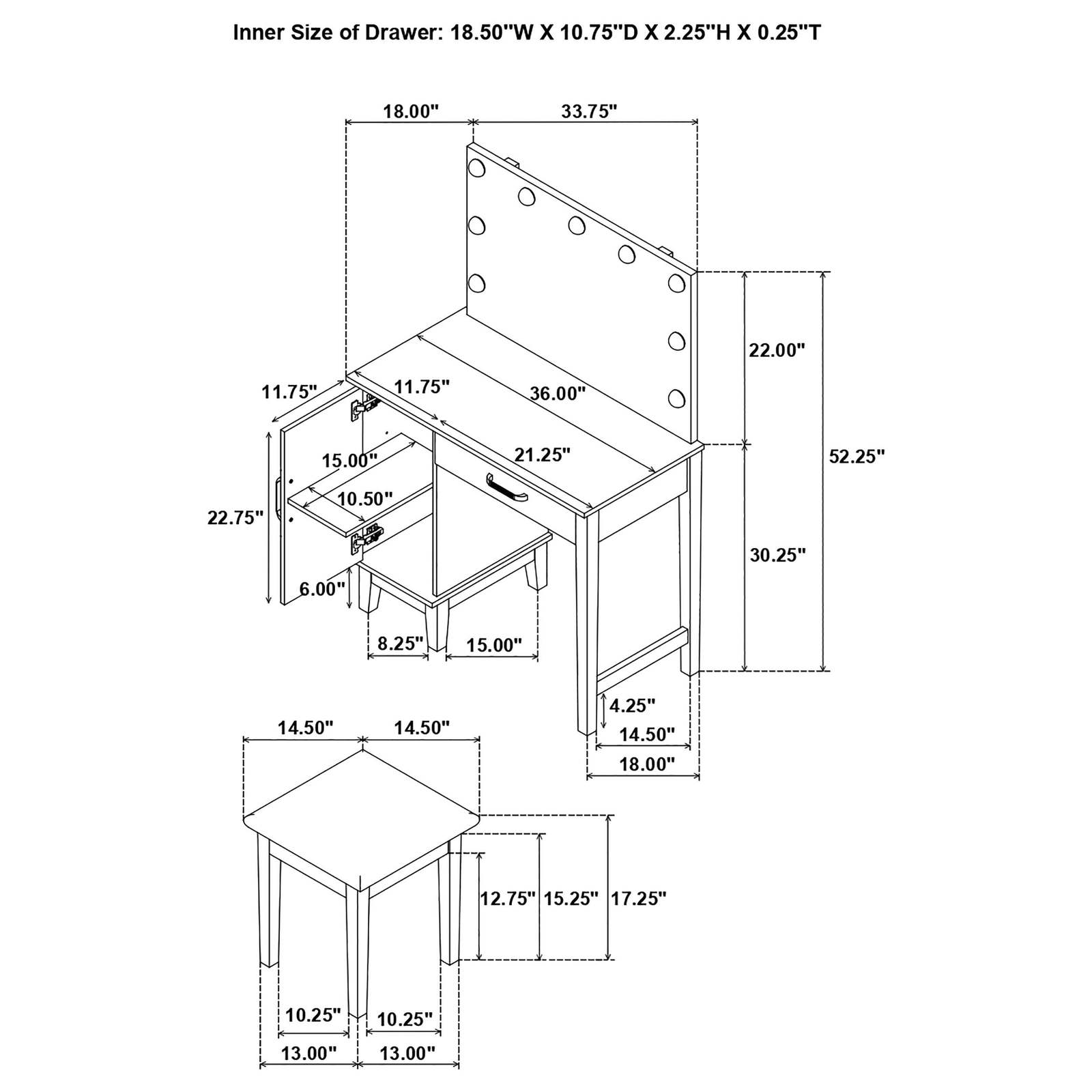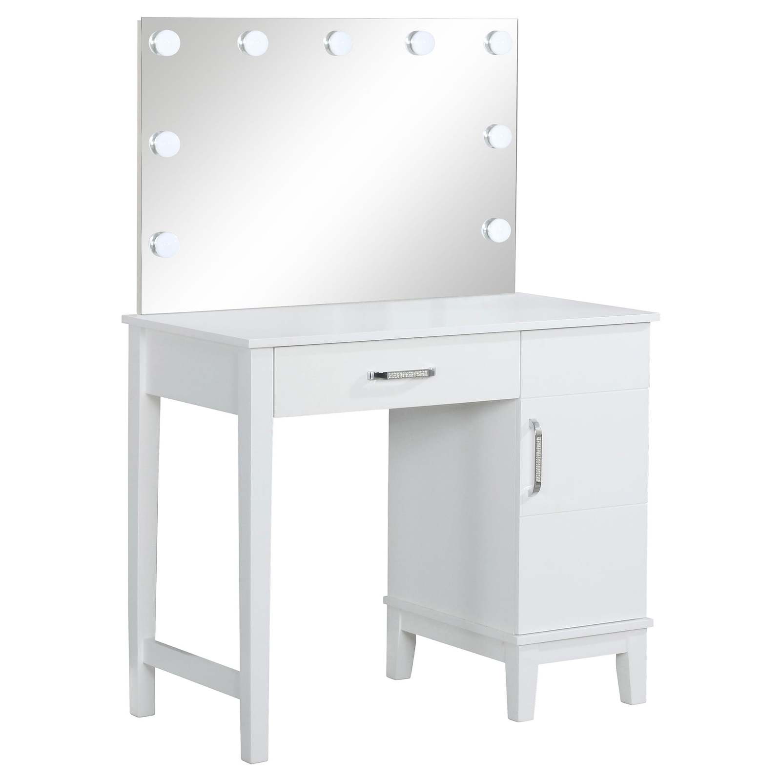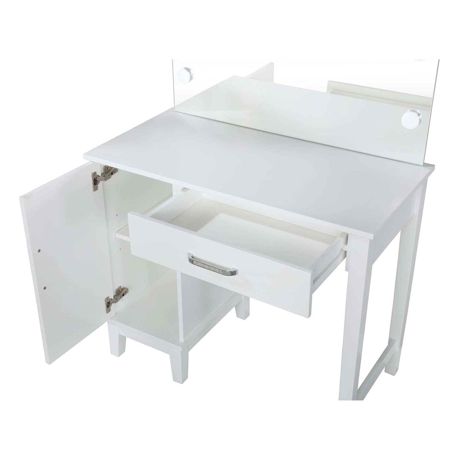 Featuring a crisp white finish, this piece delivers a clean and timeless look that complements any decor style with ease. The set includes a sleek stool, one drawer for convenient storage, and a side cabinet for additional concealed space, combining functionality and style perfectly.