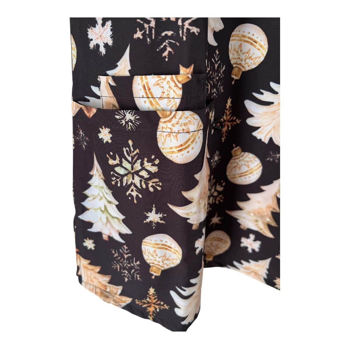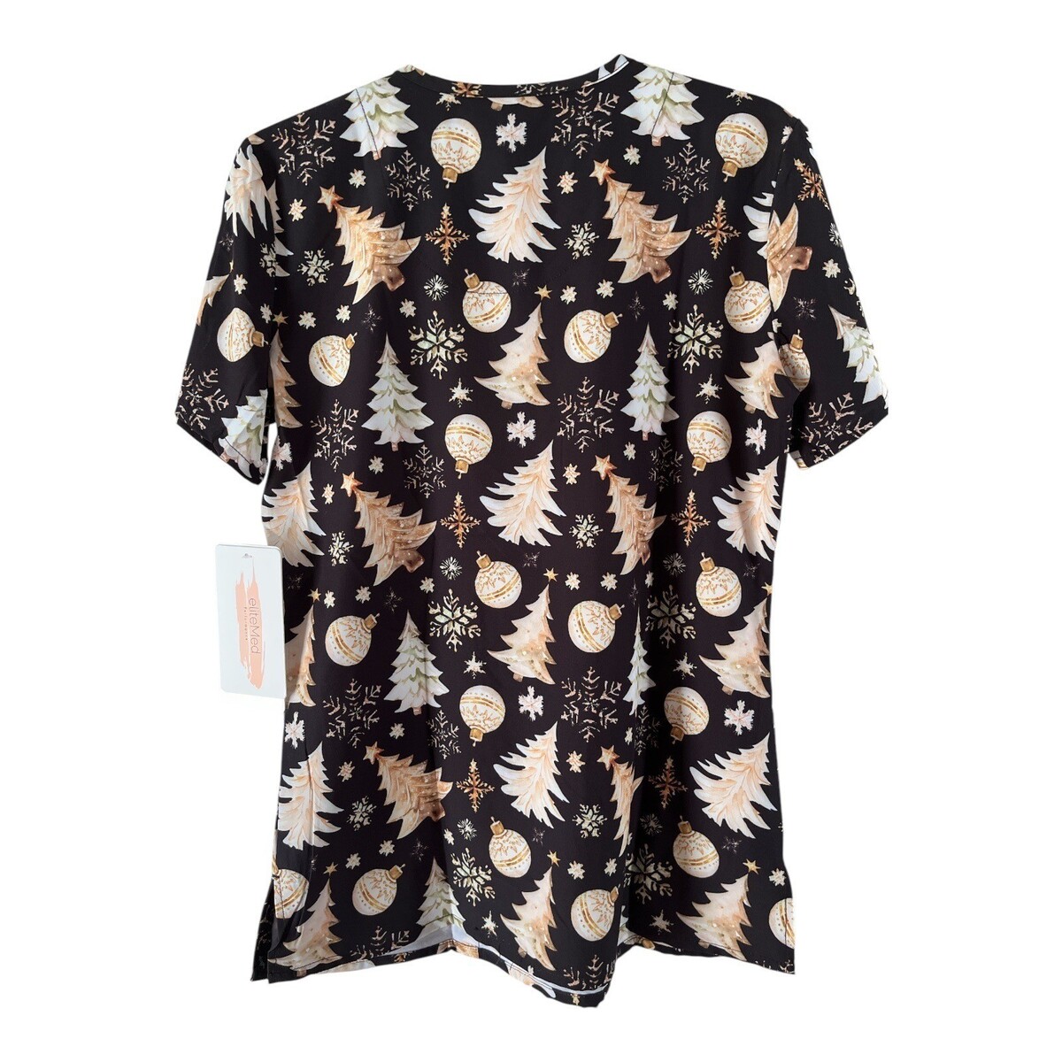 This festive scrub top by Elite Med features a cheerful Christmas print with decorated trees, snowflakes, and ornaments against a black background. Perfect for adding holiday spirit to your workday. Includes two front patch pockets for functionality. New with tags.