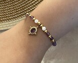This bracelet features an elegant ellipse geometric design. It's crafted from natural stones, adding a touch of nature's artistry. The amethyst stones are complemented by gold accents and white beads, creating a harmonious blend of colors. Perfect for those who appreciate unique, handcrafted jewelry.