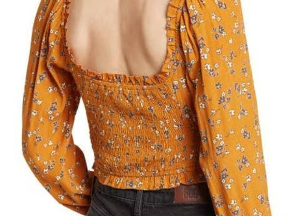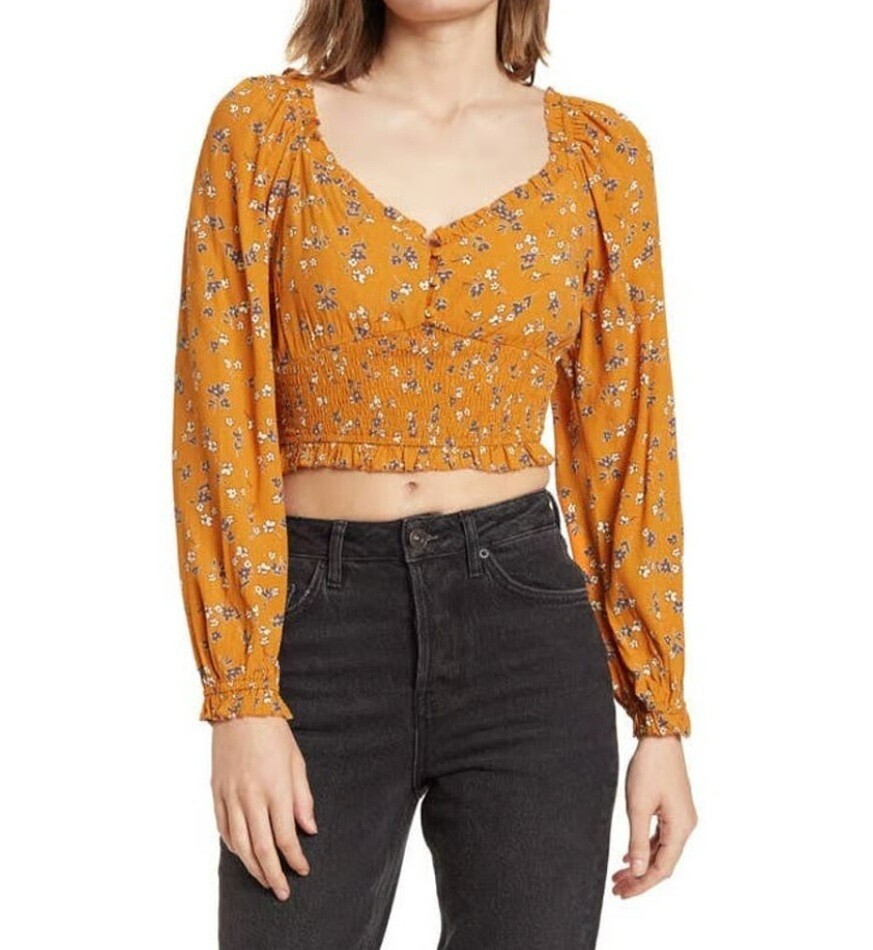 A ruffled neckline appropriately fits this flirty crop top with a smocked bodice and long puff sleeves.