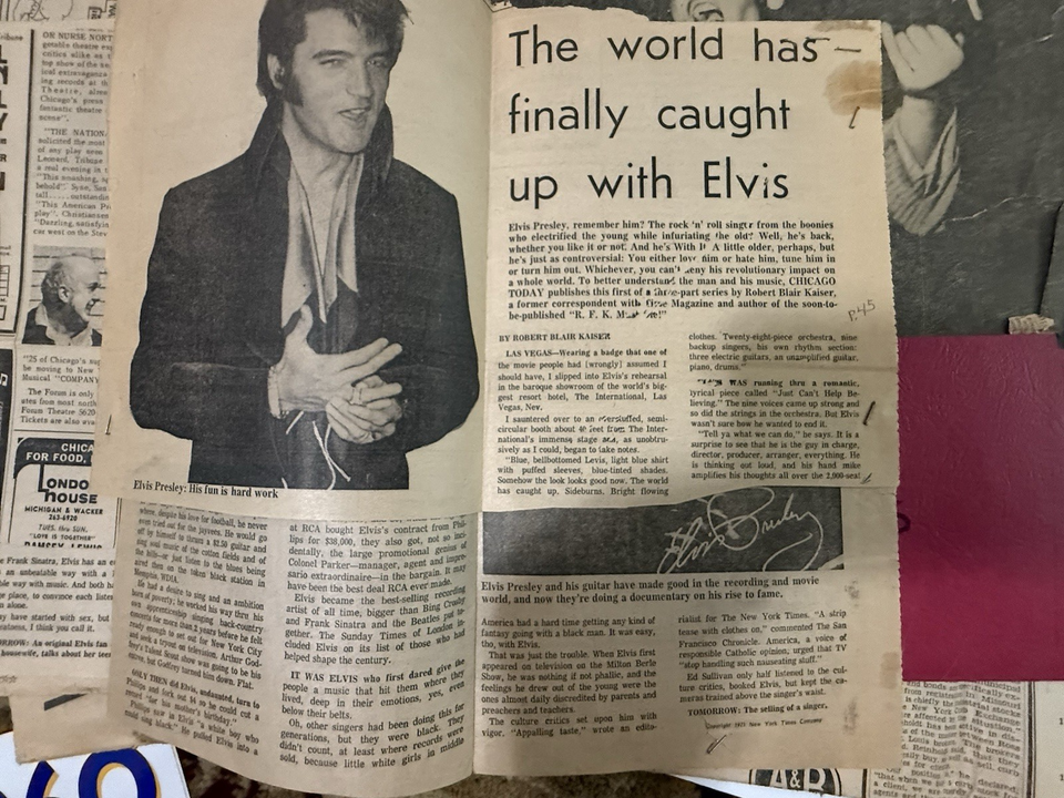 This product is a huge collection of Elvis Presley memorabilia, including original newspaper clippings, cards, and pictures. Focused on the music industry and the rock pop genre, this collection is a valuable piece of entertainment memorabilia. With a specific focus on Elvis Presley, this collection captures the legacy and impact of the iconic artist in the world of music.