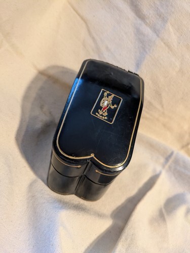 This is a vintage double deck playing card holder made of embossed black leather in Florence, Italy. The holder is designed in a retro style and features intricate detailing. It is compact in size, with specific dimensions of 1" in length and unspecified width and depth. The embossed leather adds a touch of elegance to this collectible item.
