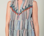 Striped sleeveless blouse in grey. V-neckline with front button detail. Features multicolor embroidery and has a flowy fit. Fuchsia tassels hem. Shirred detail sides.