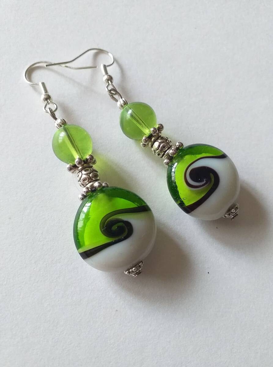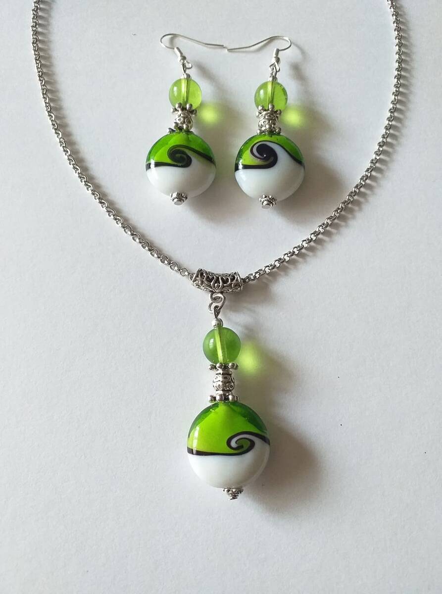 Beautiful Set of silver-tone Antique style Emerald green and white handmade glass beads necklace and earrings . Boho necklace. Bohemian necklace and earrings. Romantic necklace and earrings. Beautiful necklace with same style earrings with fine green glass beautiful beads and elegant silver-toned ornaments .