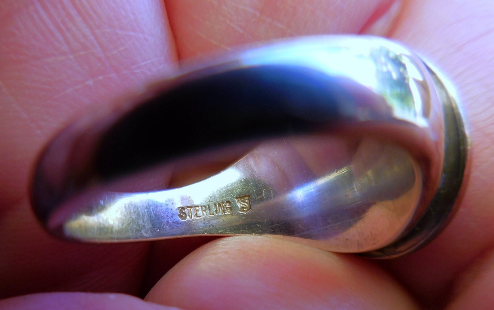 This difficult to find ring has Simon's Brothers makers mark inside the sterling silver band. Features the image and words Saint Christopher Protect Us under glass enamel in pearly white. In a size 8, the front of the ring measures 14.4mm diameter and it weighs 7.9 grams. Goes well with similar items like medals and is a thoughtful gift.