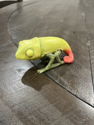This Enesco Home Grown figurine features a colorful chameleon perched on a banana pepper, adding a playful touch to any collection. Measuring 4 inches in length, 2 inches in height, and 2 inches in width, this figurine is perfect for small spaces. The item is part of the "Home Grown" collection and is an original piece with retired features. It comes unboxed and is perfect for those who love animals and dinosaurs. The figurine is in great shape and would make a wonderful gift for someone who is retiring.