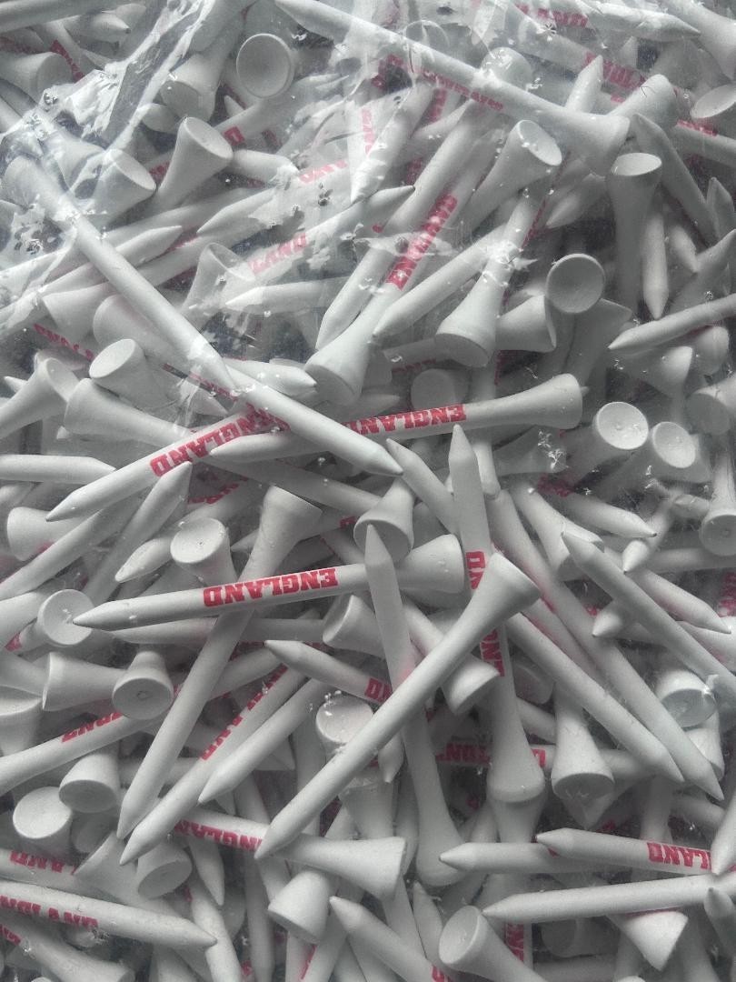 ENGLAND 100 PRINTED LOOSE WOOD 69MM GOLF TEES.