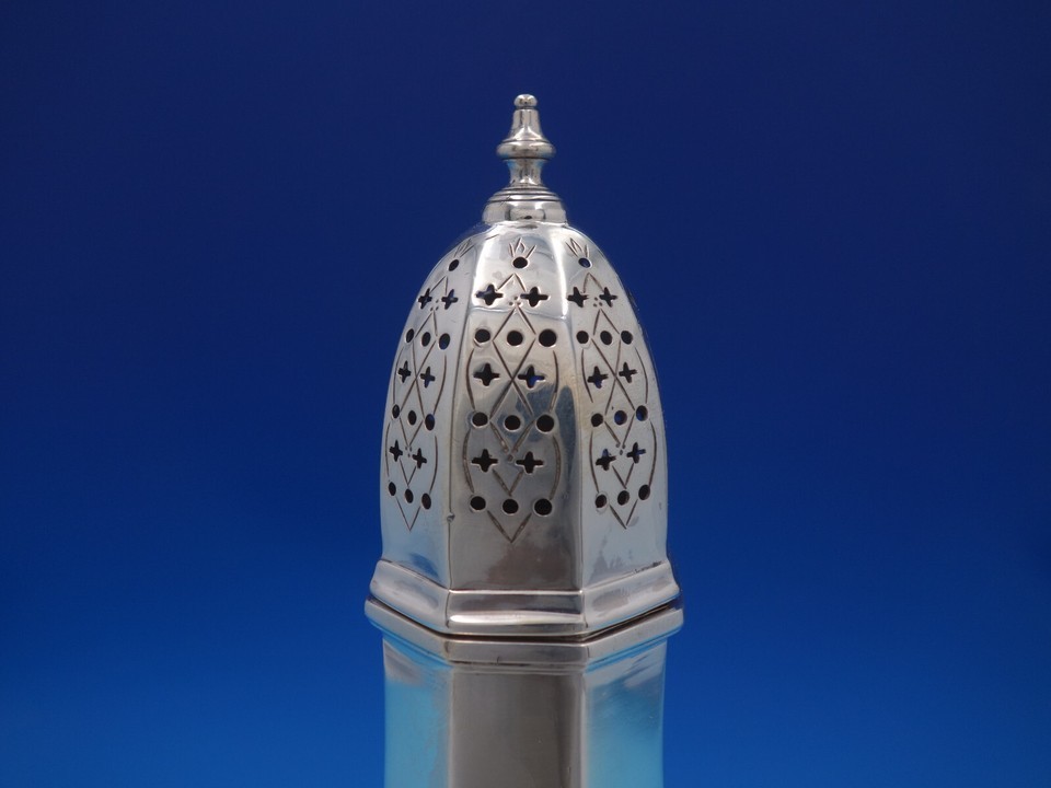 English estate sterling silver muffineer, made in Sheffield in the year 1937 (maker unknown as the mark is worn and not readable). This piece measures 8 3/8" tall and weighs 8.15