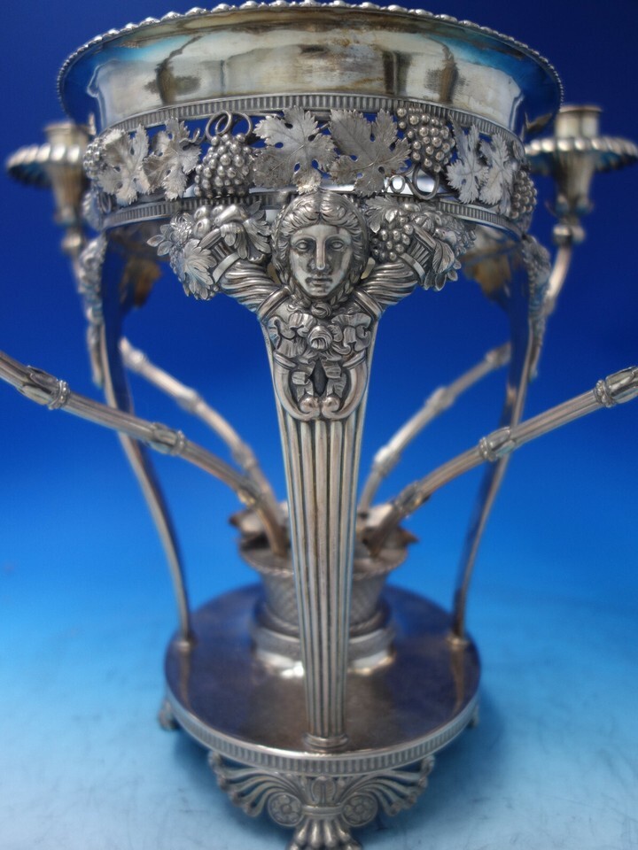 Incredible Georgian English Epergne with 4 candle holder branches made by JW Story W. Elliott, London, c.1812-1813. The design is superbly detailed with high relief Art Nouveau women, cornucopia, applied grapes and grape leaves and vines, and in the center a basket of three dimensional fruit and leaves. The center glass bowl is no longer present. The central oval opening measures 9 3/4" x 7 1/4". The piece measures 13 3/4" x 13" x 12"Ht. It is engraved with a crest and is in excellent vintage condition. Weighs 107 ozt. Fabulous. Museum quality.