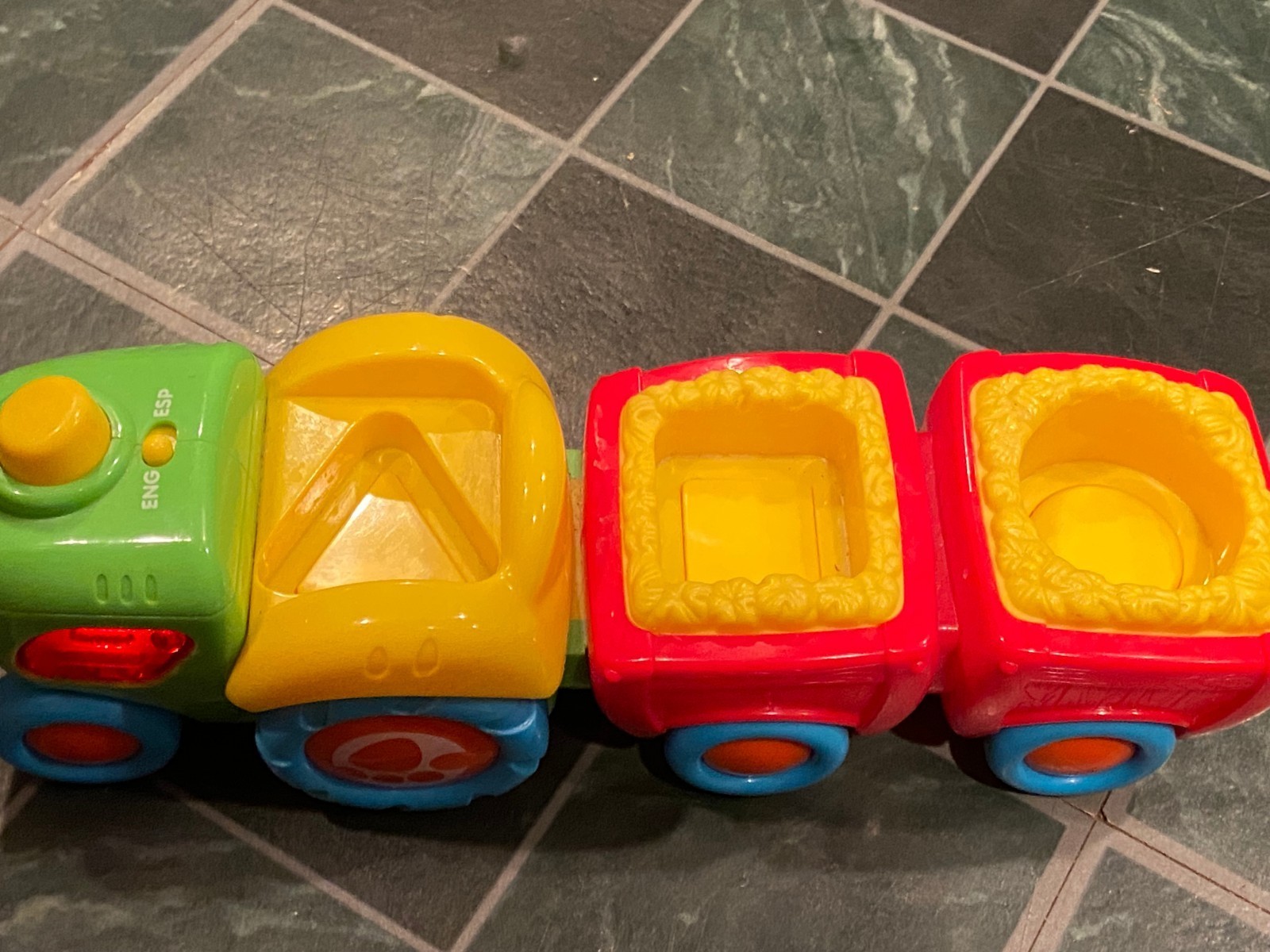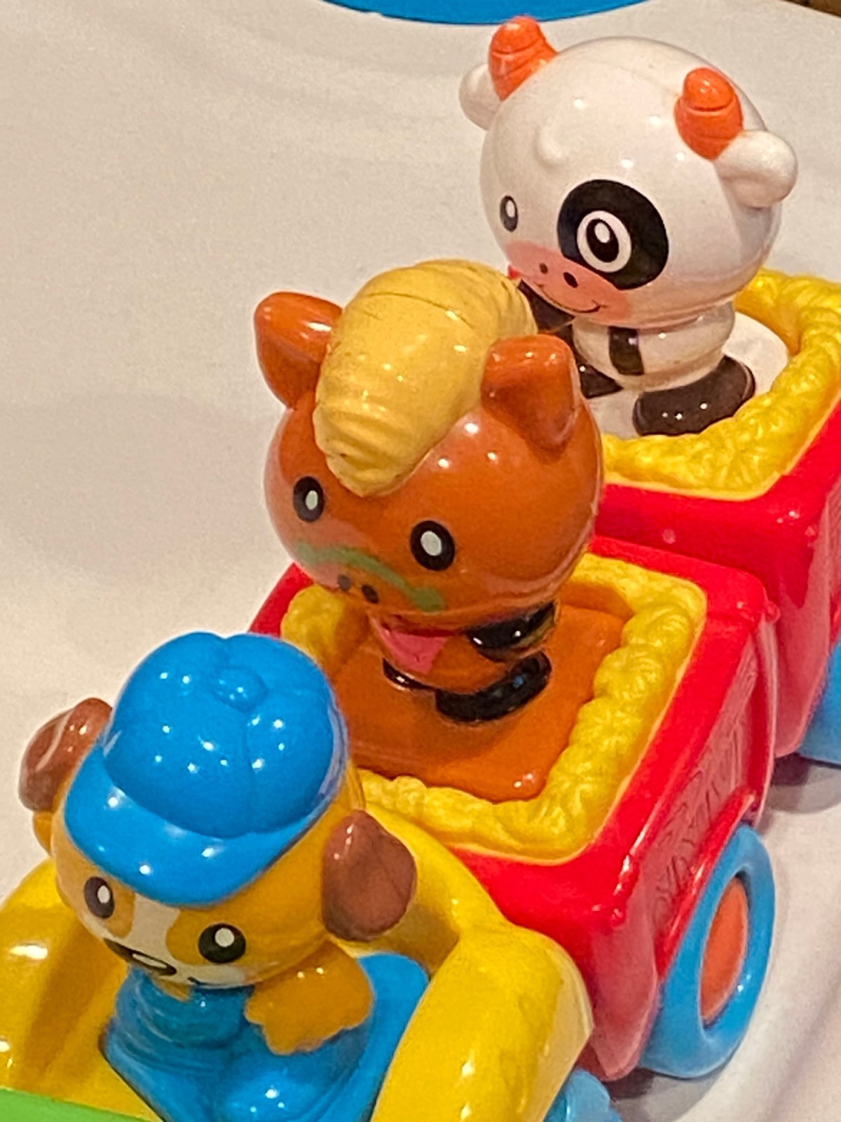 PRE-OWNED HAPPY KID TOY GROUP ENGLISH/SPANISH TOY TRAIN WITH LIGHTS AND SOUND The toy train is from Happy kid toy group. It has an English/Spanish switch on the engine. It comes with 3 figures with different shapes on their base. The dog in the front has a triangle, the horse is square based and the cow is a circle base. the horse has some paint missing on the horse's mane. Press the engine and songs and animal noises play. Push down on the figures and they say about the animal. Please look at the pictures and I've also added a video. Thanx for looking and check back often as we are always adding new and fun items. :D