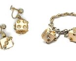 Bracelet et boucles d'oreilles avec des des en resine moulee accentues de goujons en metal dore (certains manquants).