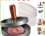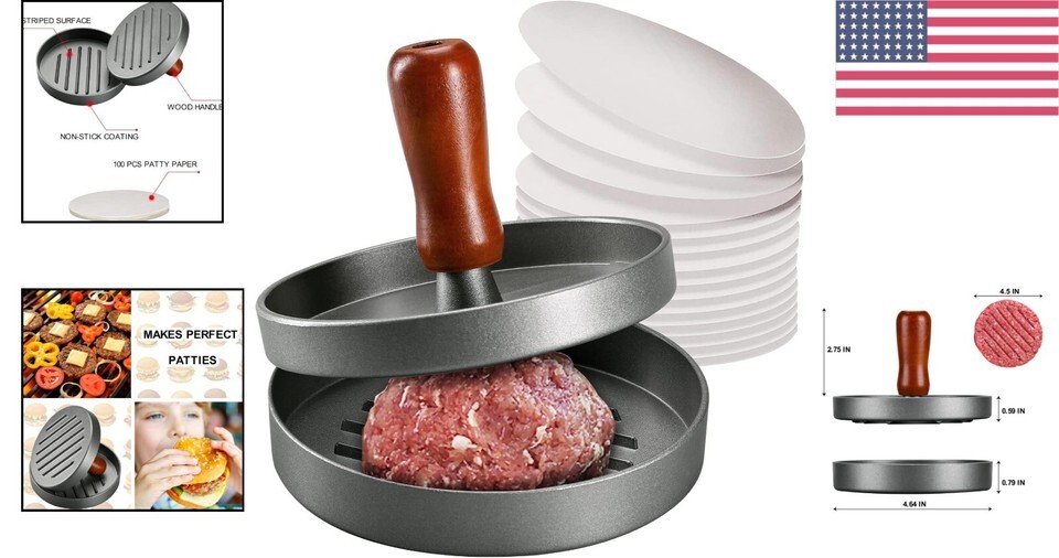 - Ergonomic Burger Press Mold - 4.5" Patties with Wooden Handle and Patty Papers