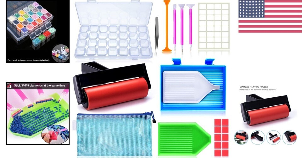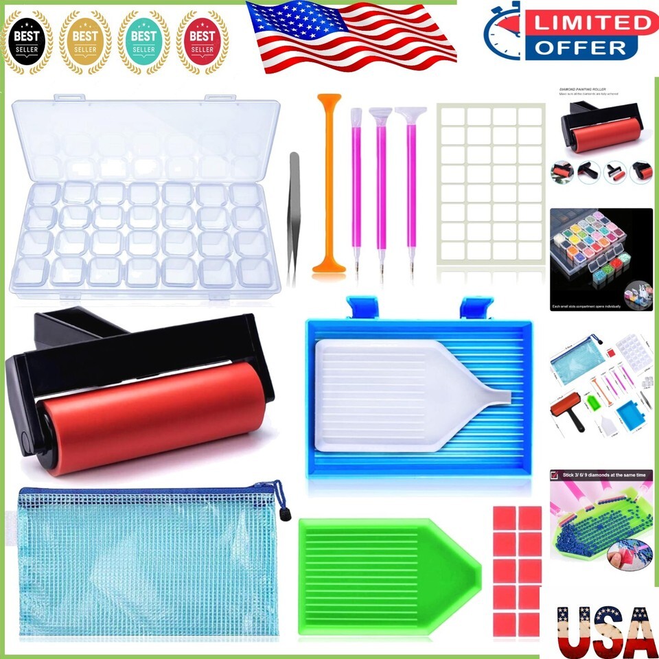 Bundled Items: Diamond Painting Roller,28 Grids Storage Box,Tweezers,Transparent Tool Bag,Diamond Pen,Diamond Tray,Label Sticker,Glue