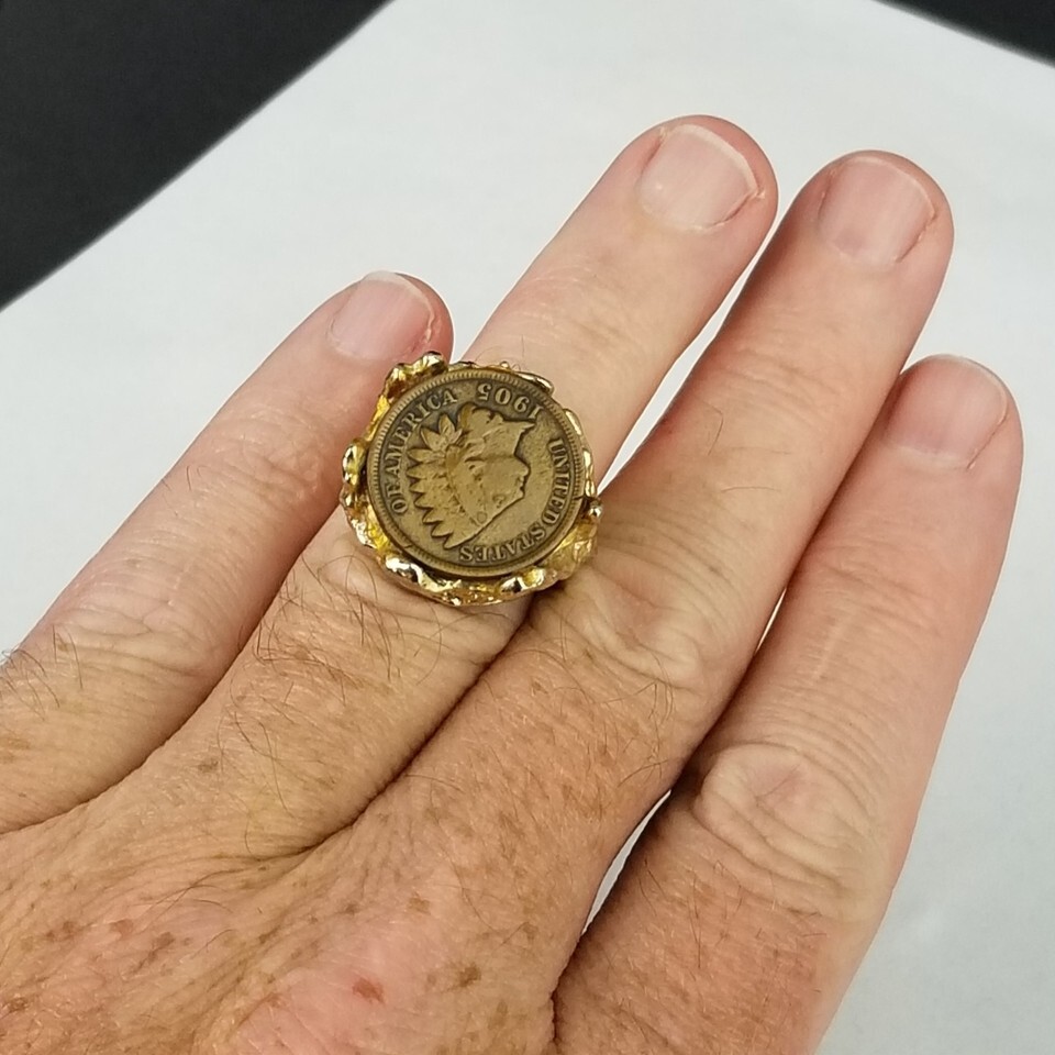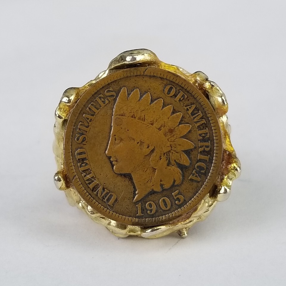 GREAT VINTAGE MEN'S RING! Purchased at an estate sale. Authentic 1905 Indian head cent with a beautiful gold tone gold nugget type design. Good shape with no major wear. Some glue residue. See pictures. Size is adjustable. Mens ring. No markings found. It is an older ring. Comes with the ring case pictured. I didnt take this to a jeweler to have tested. It will be protected well and insured. Let me know if you have questions. Location E2, FBMP, MER