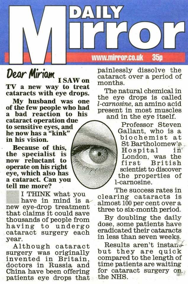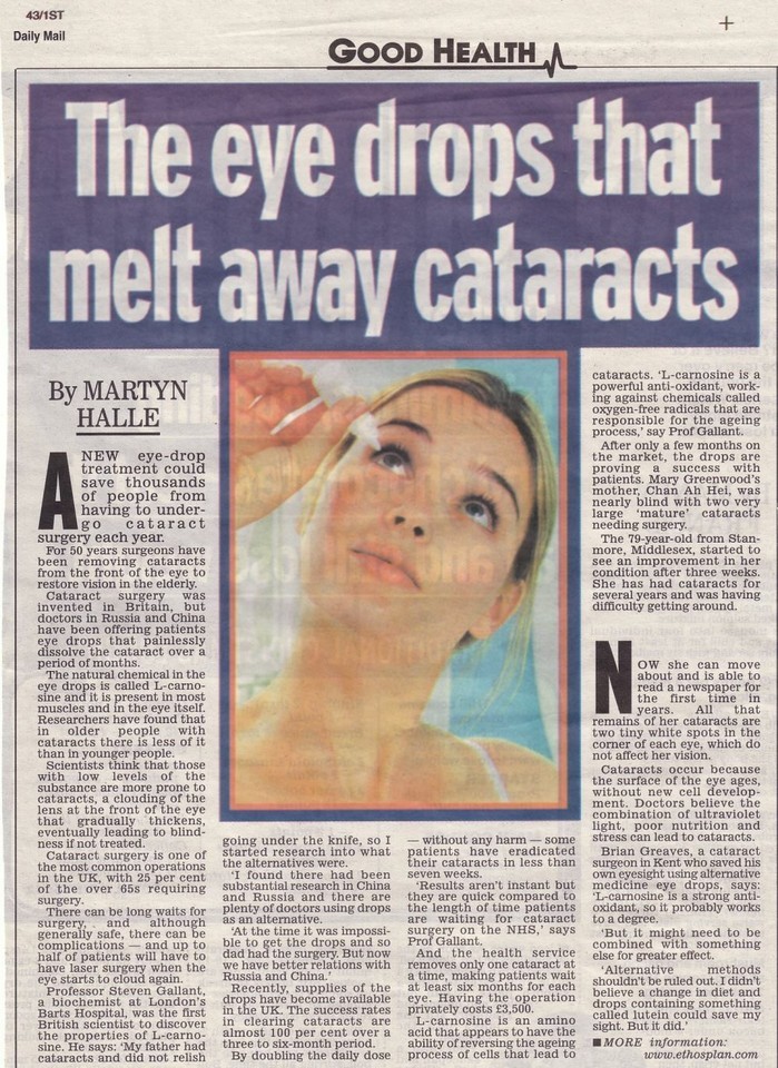 Ethos Bright Eyes Eye Drops N-Acetyl-Carnosine proved to be a success immediately the product was introduced as a treatment for those with cataracts. Cataract operations are 98% successful, but If you, family member or friend have an underlying health condition, elderly or just worried about an operation our eye drops could be the answer. Maybe the waiting lists or the cost of an operation privately maybe be a concern - These eye drops improve vision and quality of life. We always insist speaking to you eye doctor before you purchase or do your own research online.