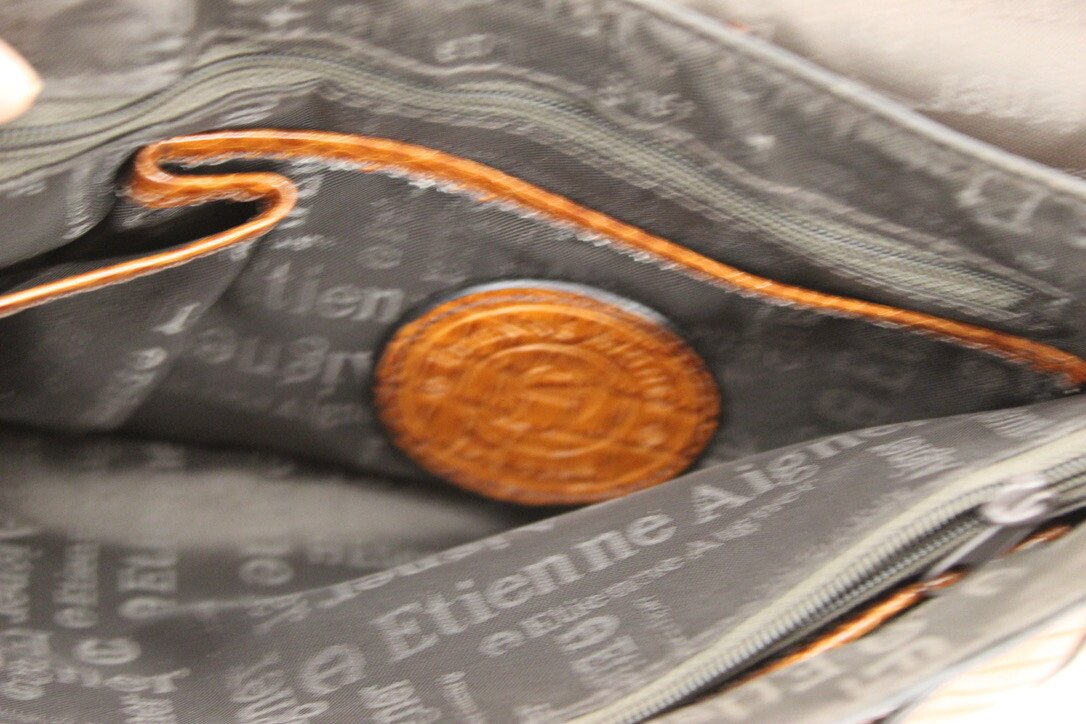 The lining( logo print) of this Aigner purse looks like it's never been used, super clean. Outside in excellent condition except for a place on the strap, I can't figure out what happened there- but it's on the underside and doesn't show..... Nice vintage bag!
