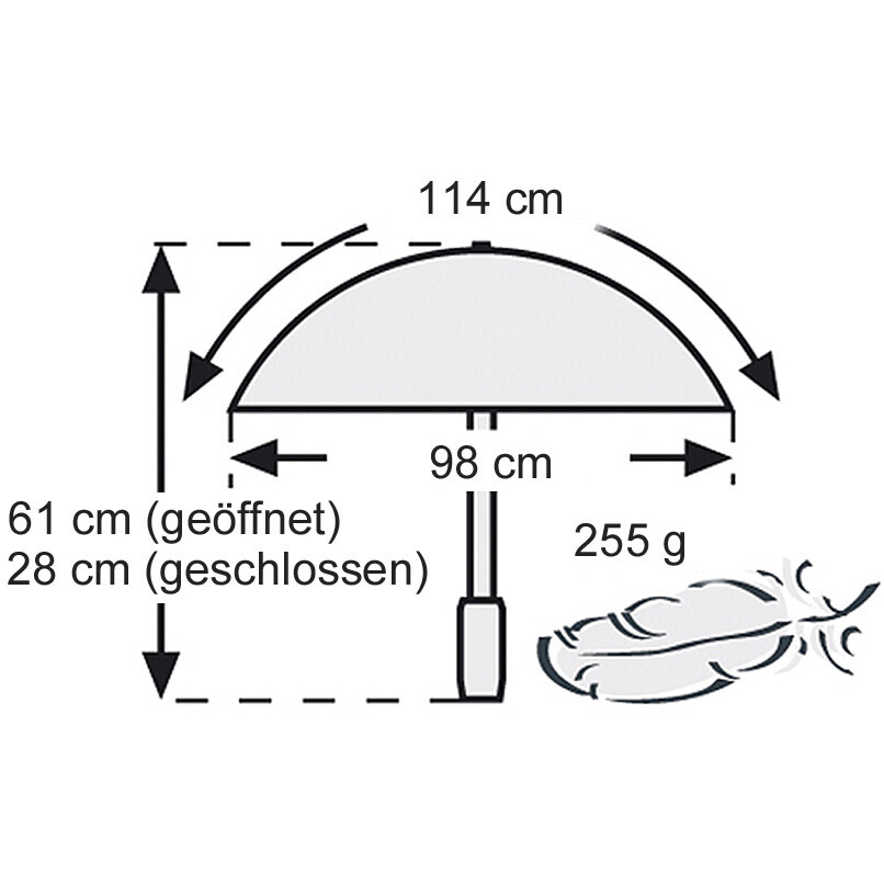 The first professional hiking pocket umbrella. Made from only the latest and best materials. Extra lightweight, extremely strong, Teflon-coated Polyester fabric with double stitched seams between segments Frame with special aluminum-profile-shaft, additional frame parts of fiberglass, anodized aluminum and fiberglass polyamide, all frame parts are highly elastic, decay- and corrosion-resistant High-density EVA hardfoam handle comfortable to the touch with a safe grip and integrated floating compass Each umbrella comes in a rugged Nylon case with Polyester mesh sides and carrying loop that allows it to be attached to your backpack or belt easily as well as an aluminum-carabiner for alternative mounting to the carrying loop EVA hard-foam-top has additional abrasion protection of the canopy, for leaving the sleeve case at home This small, convenient and lightweight hiking umbrella meets your high standards of stability and resistance even under unfavorable conditions Weight: 9oz (255g) Closed Length: 11" (28cm) Dimensions (when open) Canopy: 38.6" (98cm) Height: 24" (61cm) Width: 44.9' (114cm)