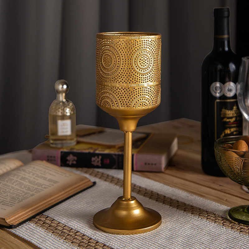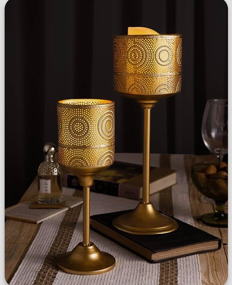 Product description: Transform any space into a romantic haven with this exquisite European Vintage Gold Perforated Metal Candle Holder from Interoknack. Standing at 9x27.5cm, this French-inspired piece features intricate geometric cutouts that create mesmerizing light patterns, perfect for setting an intimate mood. The lustrous gold finish on durable iron construction adds timeless elegance to your decor while providing lasting beauty. Whether gracing your dining table, mantel, or special event centerpiece, this versatile candle holder casts enchanting shadows that elevate the ambiance of any occasion. Its classic proportions make it an ideal choice for romantic dinners, holiday gatherings, or sophisticated celebrations. Compatible with standard pillar candles or tealights, this holder combines Old World charm with practical functionality, making it a stunning addition to your home decor or event lighting collection.