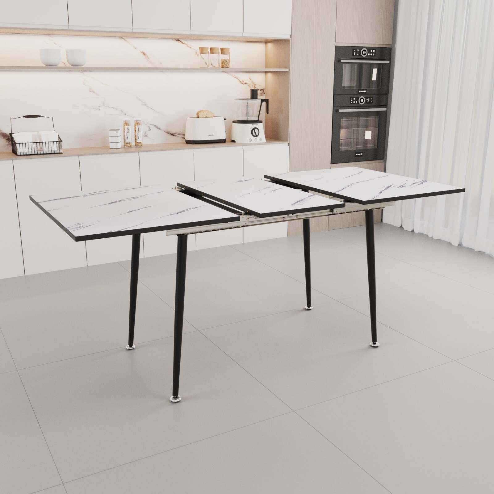 4.Simple and expandable dining table: This dining table can expand the desktop, creating a wider dining space and is easy to push and pull. 2-4 people will feel comfortable using it and there is ample space. When you have friends coming over, it can also accommodate 6 people. You can push the extension inward when you don't need it, so it saves a lot of space.