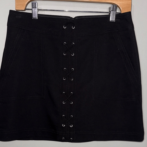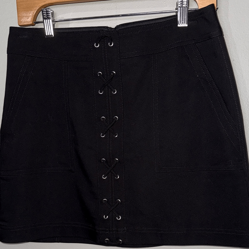Chic black skater skirt with lace-up front. Perfect for versatile styling.