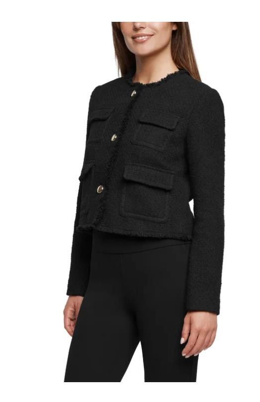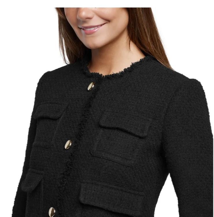 - Express Womens Blazer Black Boucle Fully Lined Pockets Fringed Collar Hem