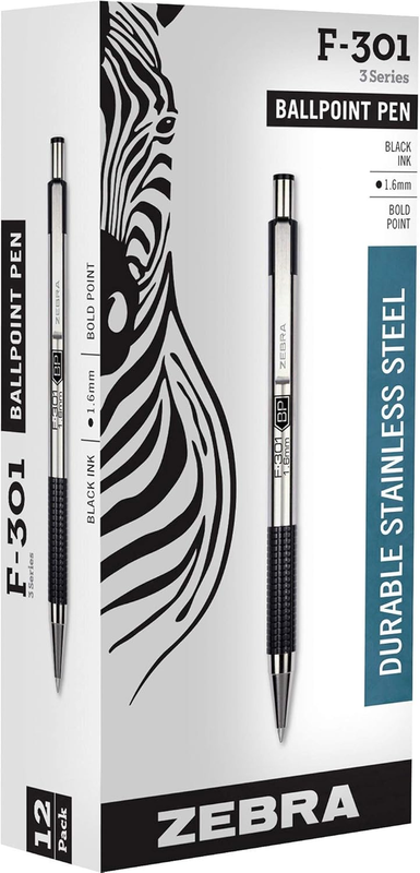 Zebra Pen F-301 Retractable Ballpoint Pen is sleek, sophisticated and easy to sanitize. This hard-working metal pen brings industry-leading precision and stability to your writing. The refillable F-301 has a metal plunge, clip and cone for an executive look. Retractable ballpoint pen has black ink and a 1.6mm bold point tip. Corrosion resistant, stainless steel barrel is easier to sanitize than plastic. Shorter barrel slips easily into shirt pockets. Comfort grip matches barrel accents. Metal clip readily attaches to a notebook, planner, work bag or briefcase pocket. This 12-count pack of attractive pens is perfect for home, school or office. Clean and stylish, this trusted pen is suitable for boardrooms, courtrooms, classrooms, medical settings, offices and job sites. It?s the right pen for any job.