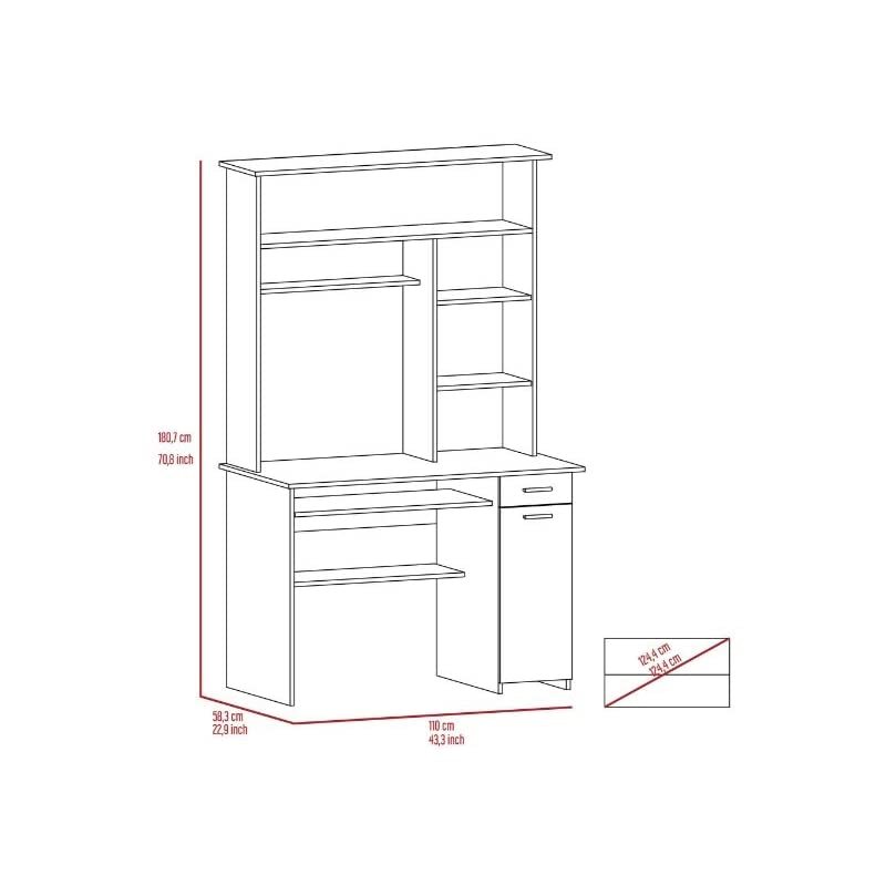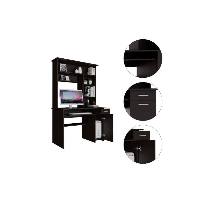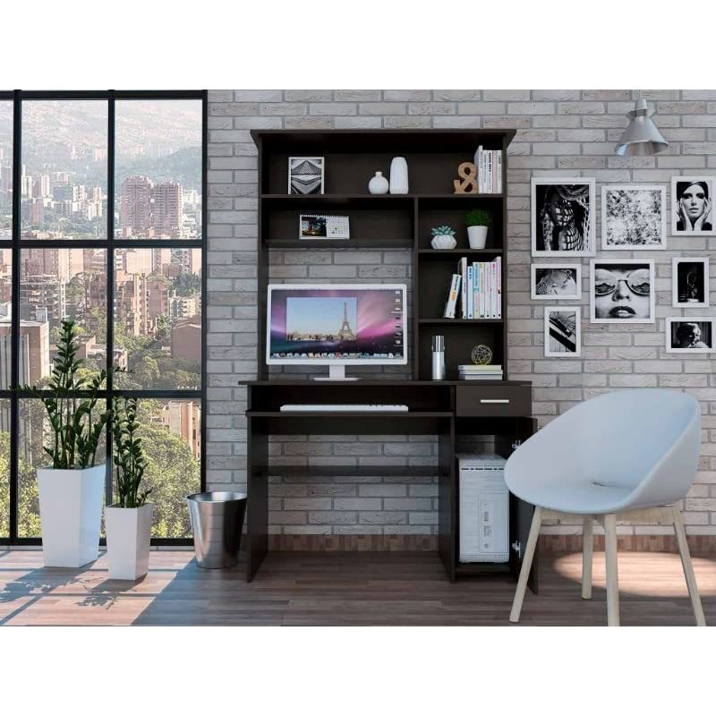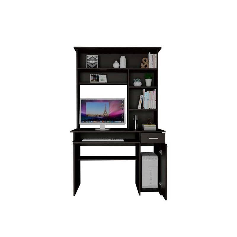 Product description: If what you are looking for is an office or home desk that fits in any space, that is light and ergonomic; this is the perfect desk for you, a beautiful flat design that allows accommodating any essential accessory for daily use in any part of the desk, it has a large number of drawers and shelves that make it easy to store files, notebooks, books or accessories that they need to work or study. You can use brackets to decorate your space without affecting the storage of your preferences. Buy yours now The Weston Two desk is a versatile and very functional product. The whole package when it comes to checking every feature a desk needs to have. A ton of features will catch your eye and cover your needs for distance learning or working from home, such as: This desk has 25.5 in the height of legroom for your comfort. A pull out keyboard tray will help you maximize the top surface space. A bottom shelf provides extra display or storage space. The top surface dimensions are 22.9 D x 43.3 W, spacious to fit a monitor screen, write or use comfortably your laptop. The hutch features five spacious shelves where you can put your documents, books, or decoration. A small drawer will provide concealed storage space. A 23.6 H cabinet was designed as a special place to put your PC tower while providing enough ventilation (no backdrop). It is made of particleboard with a black wenge finish. Product dimensions are 43.3 W x 22.9 D x 70.8 H.