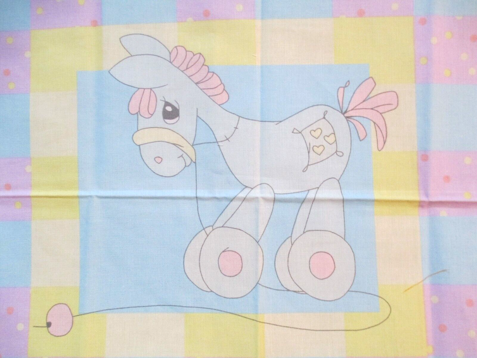 This fabric listing is by Spectrix featuring a crib panel with Precious Moments boy and girl in separate squares along with the stork and toys. It is done with pastel colors of yellow, blue, lilac and pink. Its measurements are 34" x 46". This is new fabric, 100% cotton, never washed. I am selling this for $8.95 flat shipping via first class USPS of $4.55. I combine shipping on multiple orders.