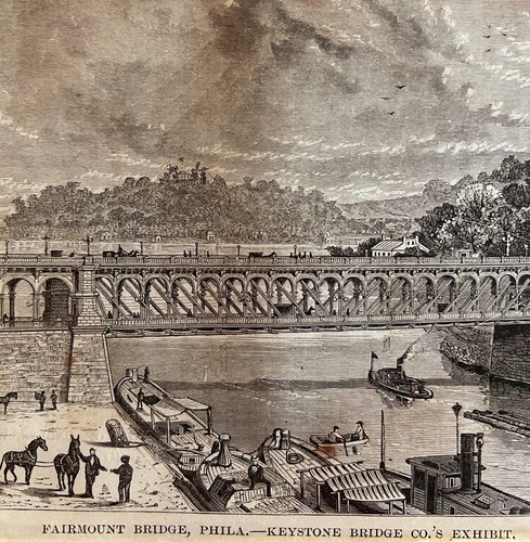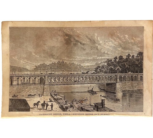 Fairmount Bridge Phila 1876 World Fair Centennial Victorian Engraving DWAA3A