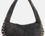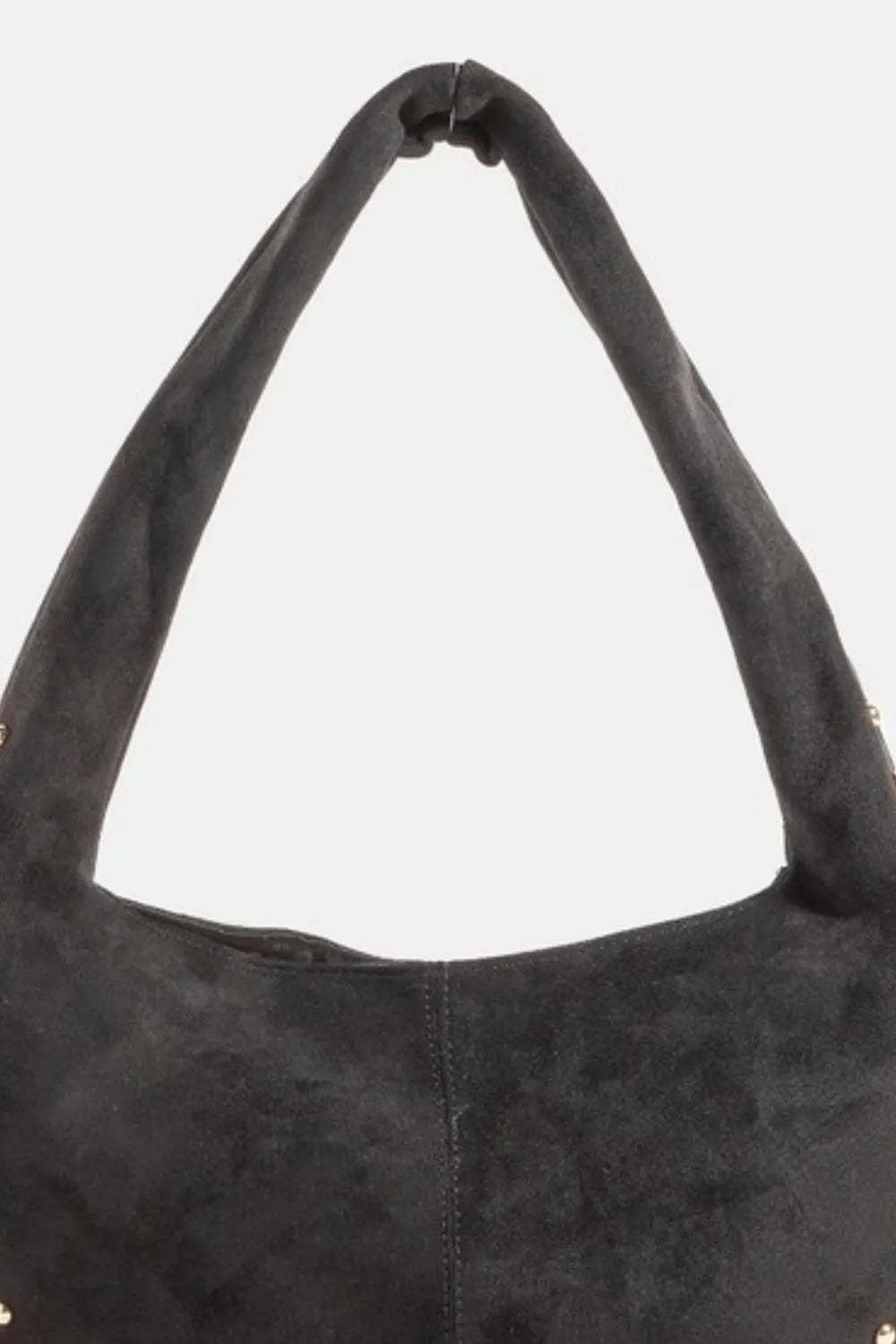 This striking black shoulder bag features a distinctive crescent moon silhouette crafted from premium suede-like material. The bag showcases elegant gold-toned metal studs strategically placed along the curved bottom edge, creating a luxurious boho-chic aesthetic. The comfortable wide shoulder strap ensures easy carrying while the spacious hobo-style interior provides ample room for daily essentials. The soft yet structured design makes it perfect for both casual daytime looks and evening occasions. The classic black colorway with metallic gold accents offers versatile styling options that complement any wardrobe.