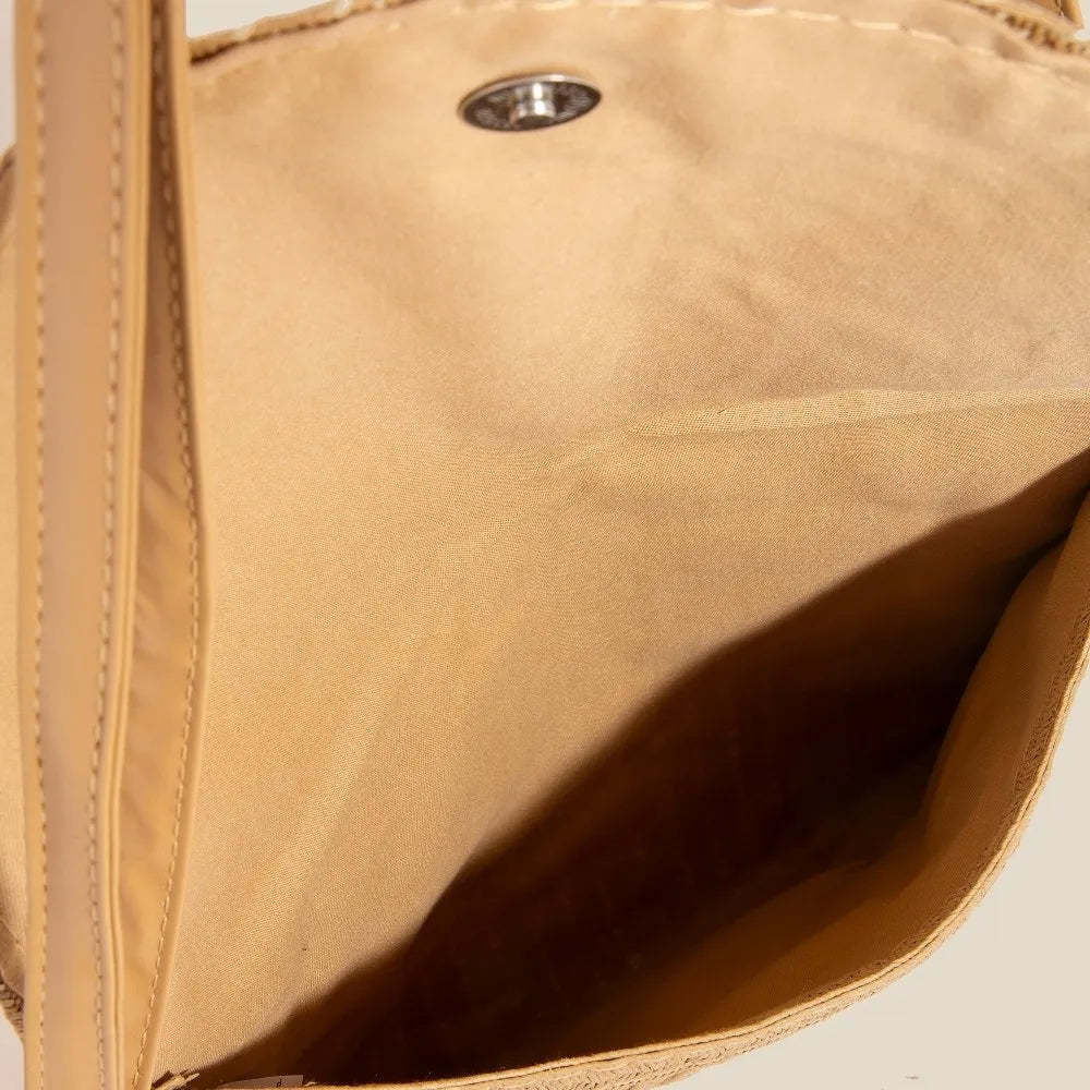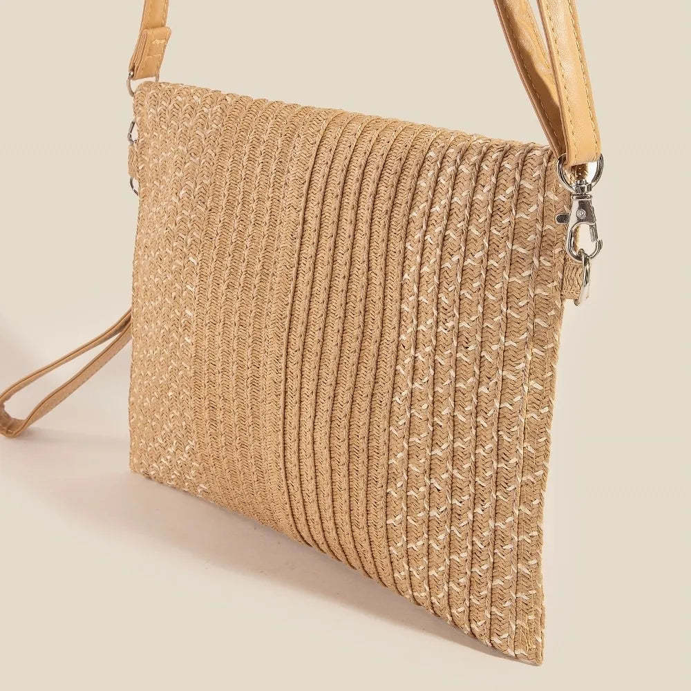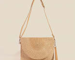 This chic bohemian crossbody bag features a beautifully handwoven straw construction in a natural beige tone, perfect for eco-conscious fashionistas. The envelope-style design is complemented by an adjustable synthetic leather strap in a matching tan color, allowing for comfortable crossbody or shoulder wear. A decorative tassel detail adds playful movement and boho flair. The compact size makes it ideal for carrying daily essentials while maintaining a lightweight feel. The intricate woven pattern showcases artisanal craftsmanship, making each piece unique. Perfect for beach vacations, summer festivals, or casual city strolls.