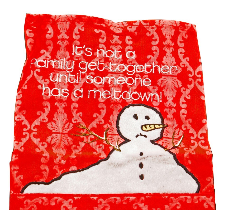 Cute child's apron with embroidered "It's not a family get together until someone has a meltdown" above a melting snowman. Embroidered Text.. Machine wash cold water gentle cycle mild detergent.. Do not bleach.. Tumble dry Sassy, Vintage style Embroidered Text Embroidered and appliqued melting snowman Perfect for your little girl helper in the kitchen Cookie cutter and small spatula included
