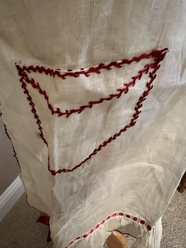 This fancy apron is made of organza material with an embroidered design in red. It features a pocket and red ribbon with bows, giving it a stylish 1950's look. Handmade in the United States, this apron is designed for women and should be hand washed only. The apron exudes a vintage charm with its 50's-60's style, making it a unique and elegant addition to any kitchen or home collection.