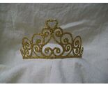 Fancy Heart Scrolls Swirls Costume Tiara. Made of thin metal. Flexible Tiara can be carefully bent/shaped to fit head size. Gold Glittered on the front. Glitter does shed. Has plastic hair combs that can be put on the ends to help secure wear (if desired). Could be used with costumes such as listed below: For Adult Use - Not intended for children.