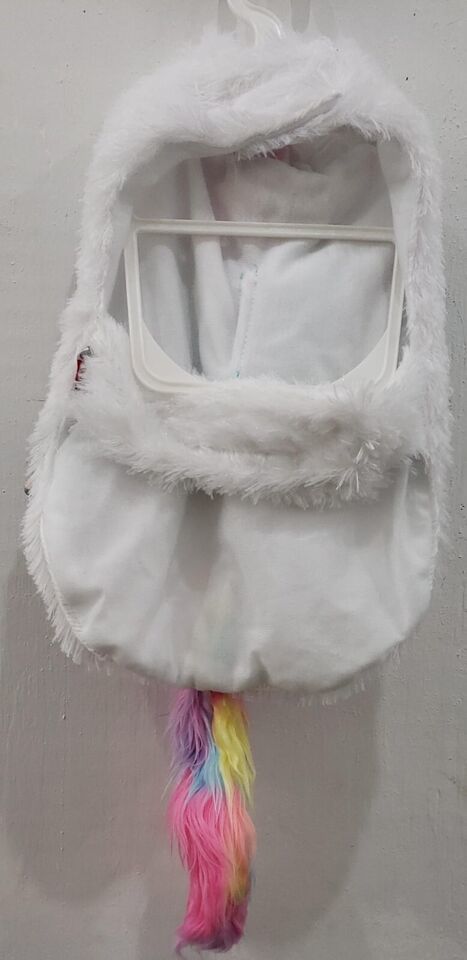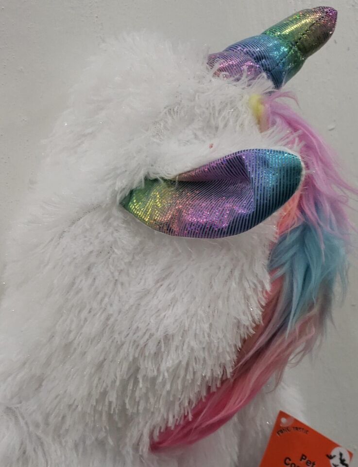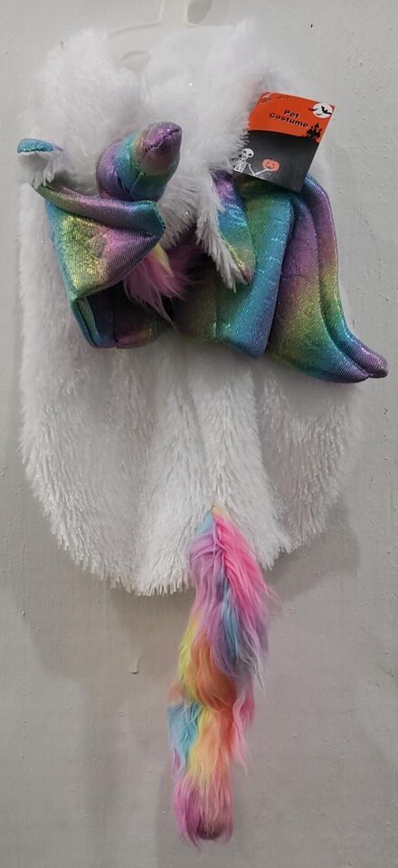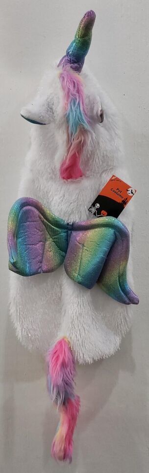 Fang Tastic Halloween Unicorn Pet Costume, Back Length 14in(36cm) Size M Unleash your pet?s inner mythical creature this Halloween with our Fangtastic Halloween Unicorn Pet Costume! Designed for whimsy and wonder, this enchanting outfit will transform any furry friend into a majestic unicorn. The costume features an all-white body suit that radiates purity and magic, complete with opalescent wings that glimmer in an array of colors when they catch the light?perfect for catching everyone?s eye during trick-or-treating or at any festive gathering. Atop your pet?s head sits a spiraled horn with the same mesmerizing iridescent finish, ensuring they?ll be the center of attention wherever they go. The pastel pink and blue accents on the flowing mane and tail add just enough color to complement the ethereal white base without overpowering it. Easy to put on and comfortable for your pet to wear, this Fangtastic Halloween Unicorn Pet Costume is sure to be a hit while ensuring your four-legged companion feels like part of the holiday fun