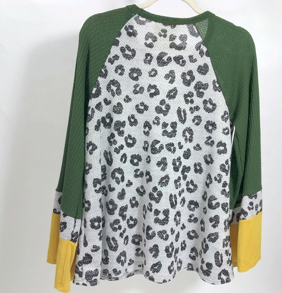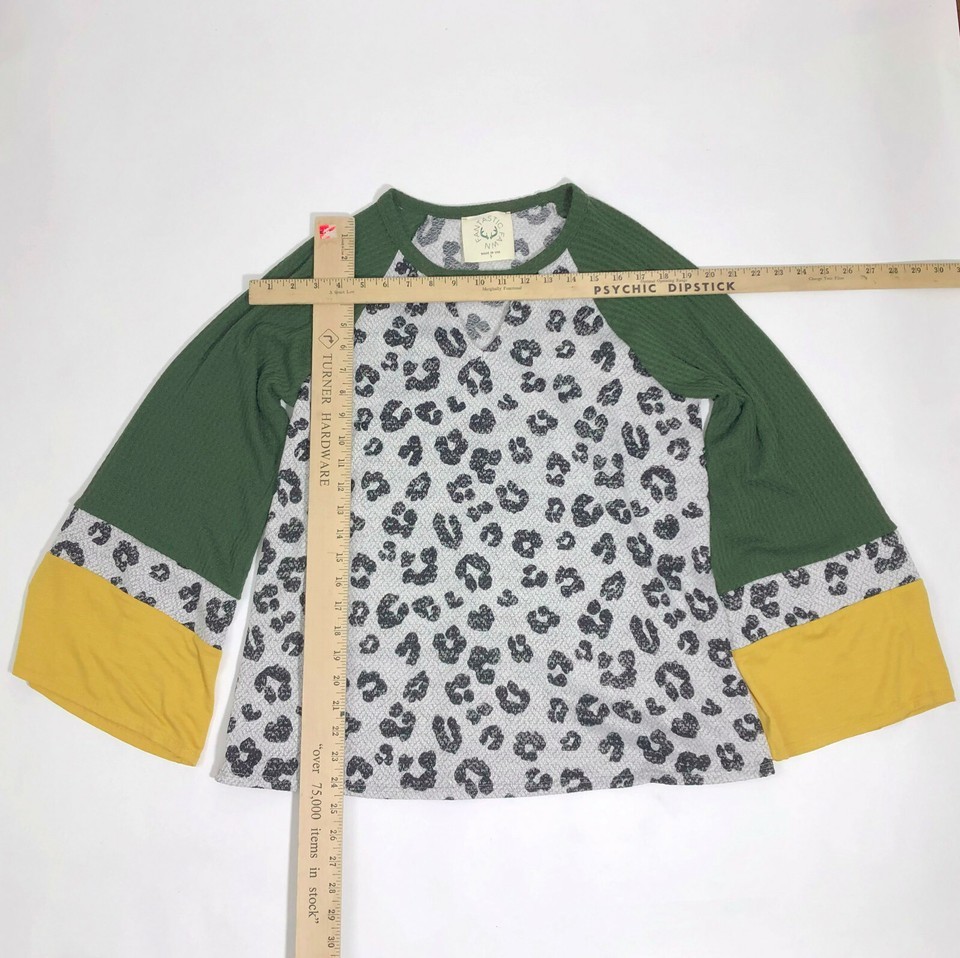 Bell sleeves, Keyhole Neckline, double stitched cuff hems |