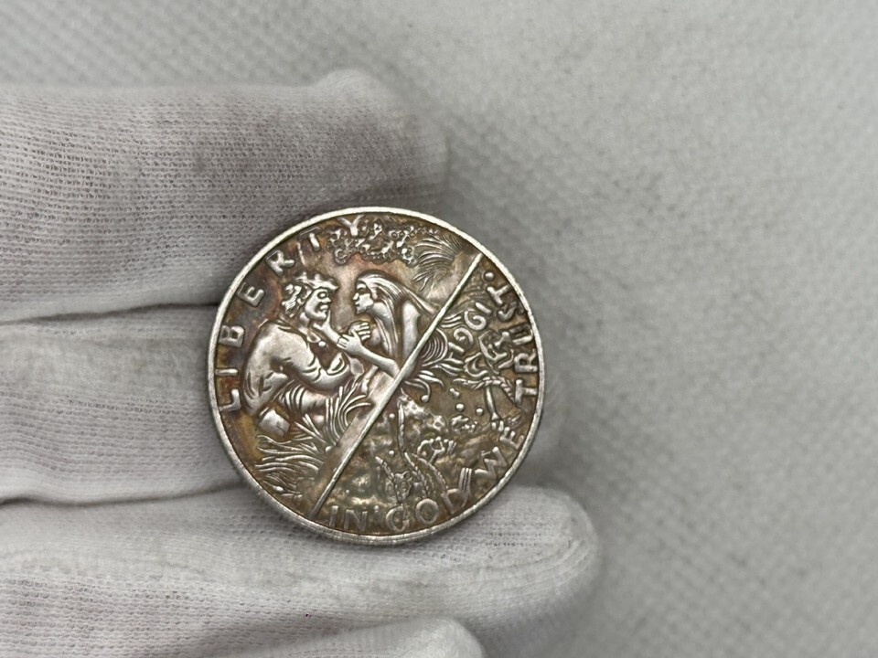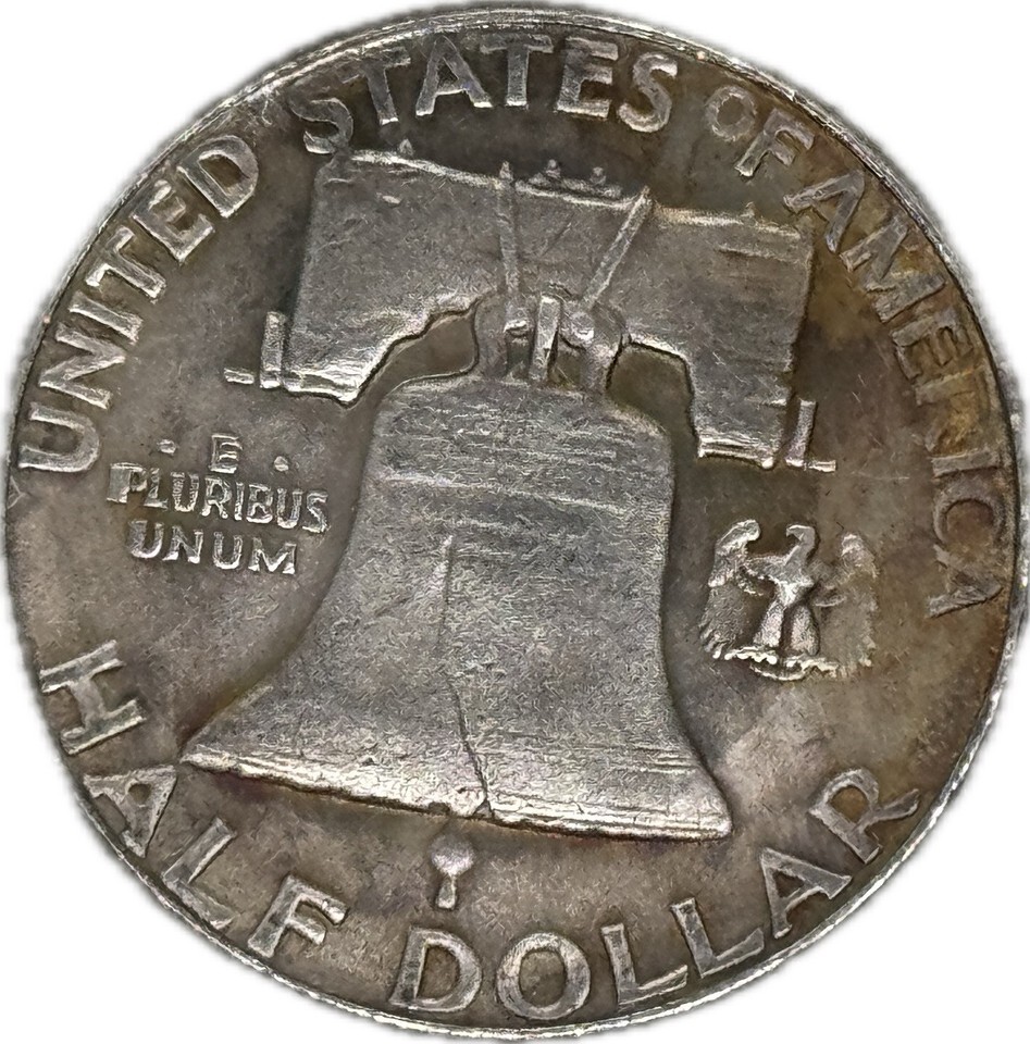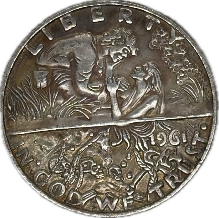 Das Jahr 1961 fügt einen historischen Touch hinzu, obwohl dies eine moderne Neupragung ist, die von den künstlerischen Hobo-Dollars inspiriert ist - Münzen, die Anfang des 20. Jahrhunderts einzeln graviert wurden. Die Rückseite bewahrt das traditionelle Aussehen des amerikanischen Half Dollars, insbesondere des Franklin Half Dollars, der zwischen 1948 und 1963 in Umlauf gebracht wurde. Dominiert diese Seite ist die ikonische Freiheitsglocke, ein Symbol der amerikanischen Unabhangigkeit, begleitet von einem kleinen Adler. Dieses Design spiegelt die amerikanische Nachkriegszeit und ihre Werte wider.