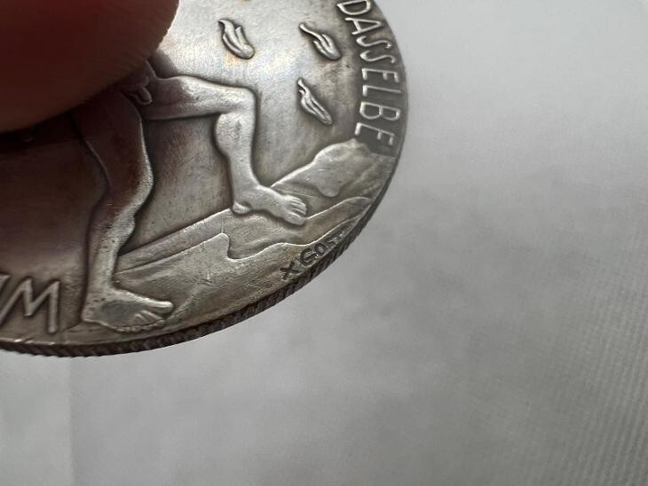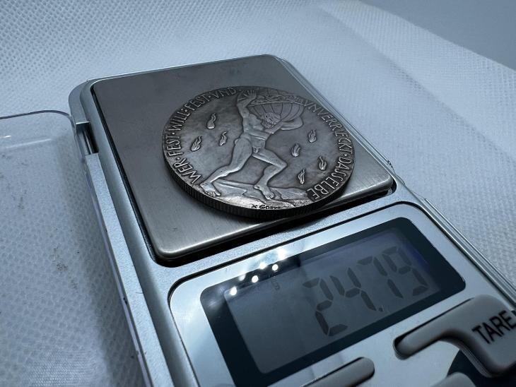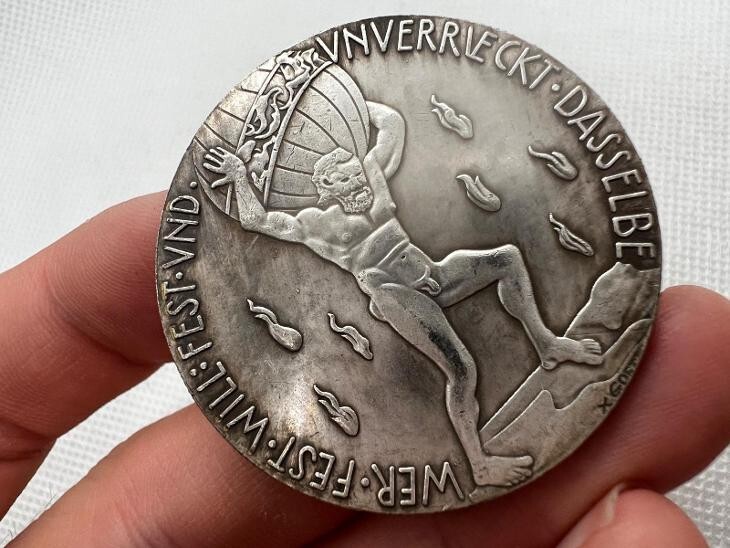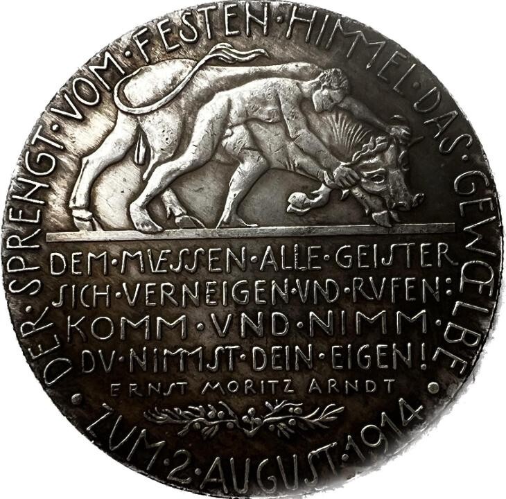 Au revers, la representation de la lutte entre l'homme et le taureau symbolise l'energie brute et la brutalite declenchees par les evenements de guerre, accompagnees d'un verset profond qui parle de bravoure et de l'accomplissement honorable de ses devoirs envers la patrie. L'inscription "Zum 2. Août 1914 marque distinctement le debut de la Premiere Guerre mondiale, amplifiant la puissance globale de la composition.