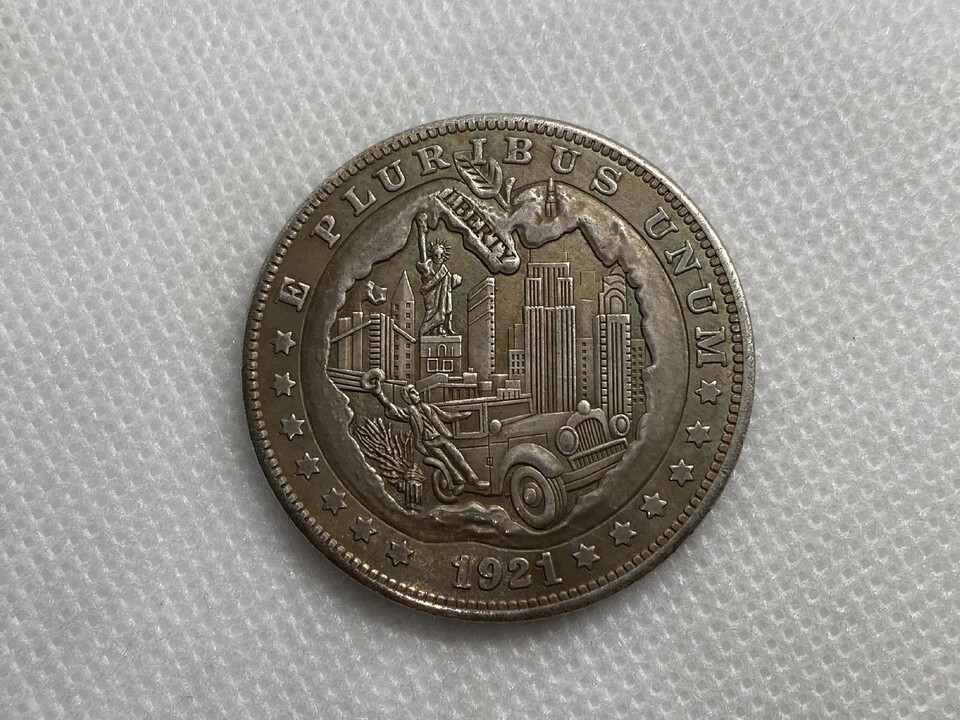 Diese Fantasy-Replik-Münze von 1921 mit dem Freiheitsstatue-Design ist eine faszinierende Mischung aus historischer und zeitgenossischer Kunstfertigkeit, die Sammler und Enthusiasten gleichermaßen anzieht. Die Vorderseite zeigt den ikonischen Ausdruck "E PLURIBUS UNUM", der die Einheit der Vereinigten Staaten symbolisiert, zusammen mit einer einzigartigen Darstellung einer stadtischen Landschaft, die die Freiheitsstatue, Wolkenkratzer und ein Automobil umfasst. Diese bemerkenswerte Bildsprache spiegelt die rasante Entwicklung und Urbanisierung der Vereinigten Staaten wahrend des frühen 20. Jahrhunderts wider. Die Anwesenheit eines Mannes auf einem Motorrad unterstreicht die fortschreitende ra des Transports. Auf der Rückseite symbolisiert das traditionelle Motiv des amerikanischen Adlers mit einem Olivenzweig und Pfeilen Frieden und Krieg, eingerahmt von den Inschriften "UNITED STATES OF AMERICA" und "IN GOD WE TRUST", um die Authentizitat dieses Sammlerstücks zu gewahrleisten. Die Stückelung von ONE DOLLAR ist unten gut sichtbar angezeigt. Diese neu gepragte Münze bewahrt originalgetreu das ursprüngliche Design und fügt gleichzeitig eine moderne künstlerische Note hinzu, was sie zu einer großartigen Erganzung für jede Sammlung macht.