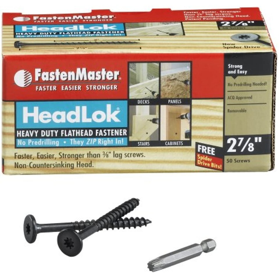 Product Description FastenMaster FMHLGM278-50 HeadLOK Heavy-Duty Flathead Fastener, 2-7/8 Inches, 50-Count From the Manufacturer Save time, money, and labor costs. HeadLOK eliminates the need to predrill and hand-ratchet in 3/8 inch galvanized lag screws in wood-to-wood projects. HeadLOK's aggressive threading and sharp gimlet point allows it to zip right into wood or OSB without predrilling. Plus, the wafer head eliminates the need for washers and offers increased pull through strength. Perfect for deck framing, stair stringers, fencing, cabinets, and more! Sizes are perfect for virtually any dimensional wood-to-wood project. HeadLOK fasteners are American made.