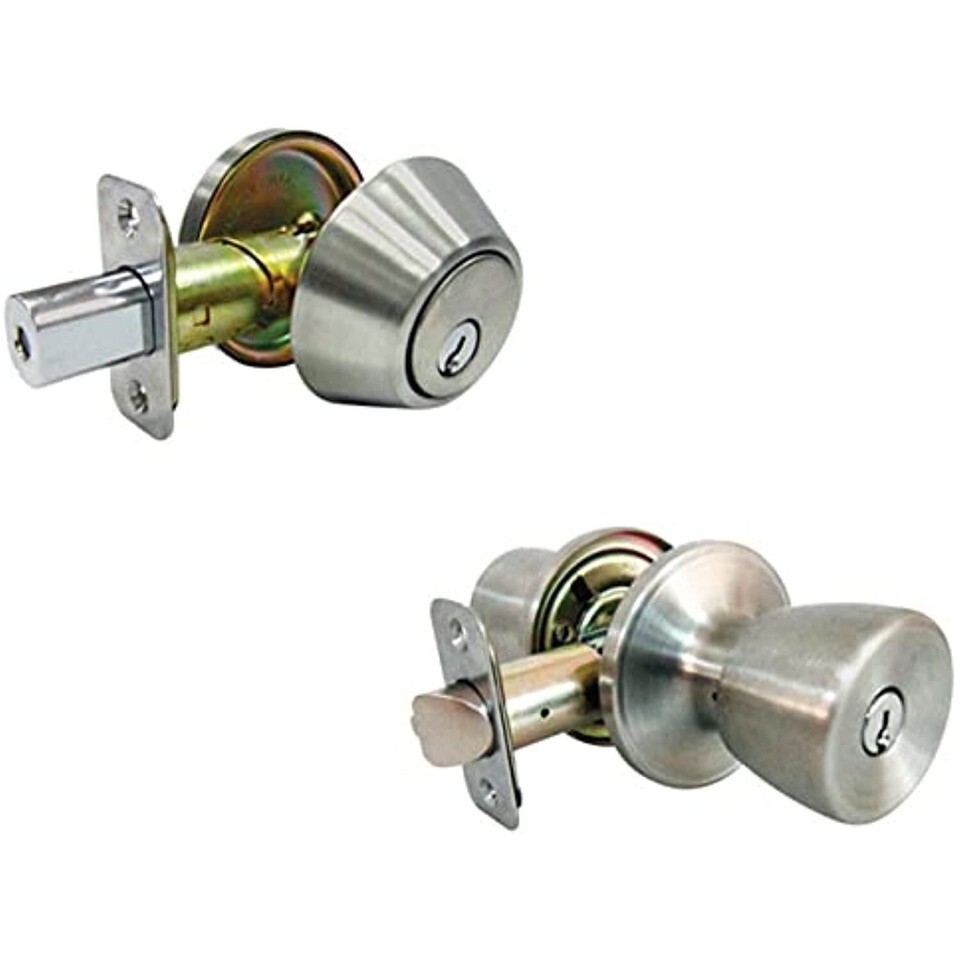 Brand Name: Faultless Style: Tulip Finish: Satin Stainless Steel Material: Metal Product Type: Entry Knob and Single Cylinder Deadbolt Grade: 3 Grade Door Direction: Right Handed Knob Style: Tulip Minimum Door Thickness: 1-3/8 inch in. Backset Dimension: 2-3/8 to 2-3/4 in. Commercial or Residential: Residential ADA Compliant: No Packaging Type: Clamshell Indoor or Outdoor: Outdoor Lockset Type: Keyed Number of Keys Included: 4 Maximum Door Thickness: 1-3/4 inch in.