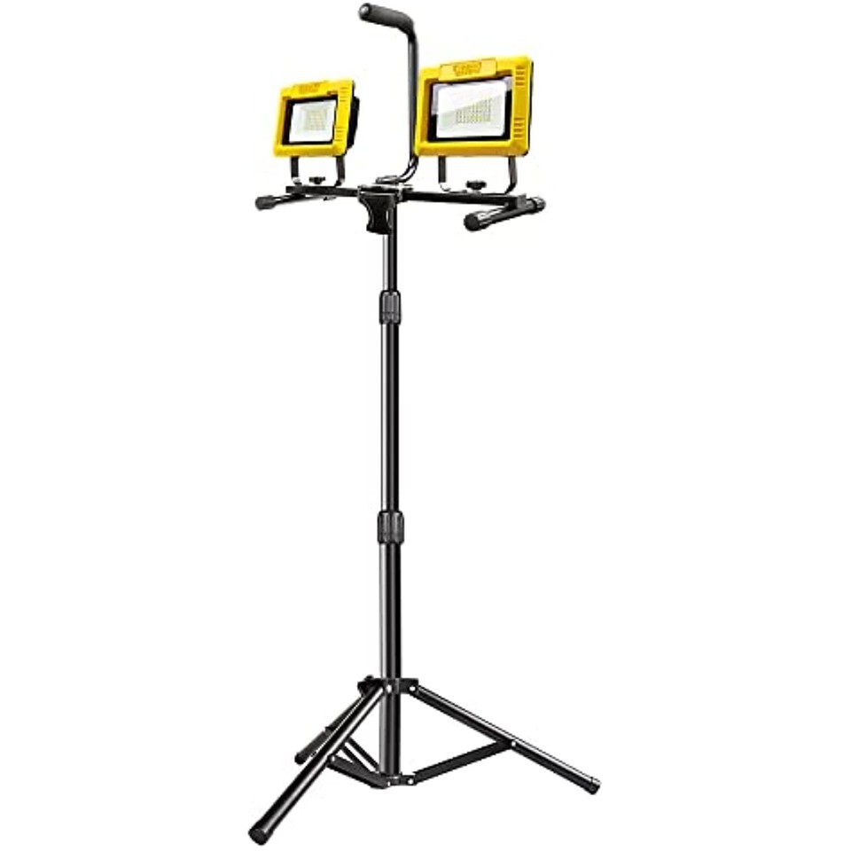 ? PORTABLE AND ADJUSTABLE - The portable LED work light has an attached carrying handle with H-stand allows easy transport; the adjustable dual-head and telescoping metal tripod are ideal for all lighting situation; tripod can be extended to 61 in. tall