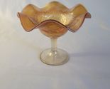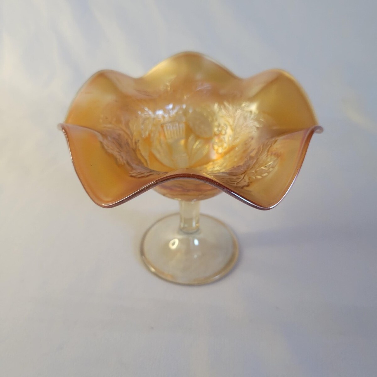 - Fenton Marigold Footed Compote Dish Peacock Urn Ruffled Edge Carnival Glass EUC