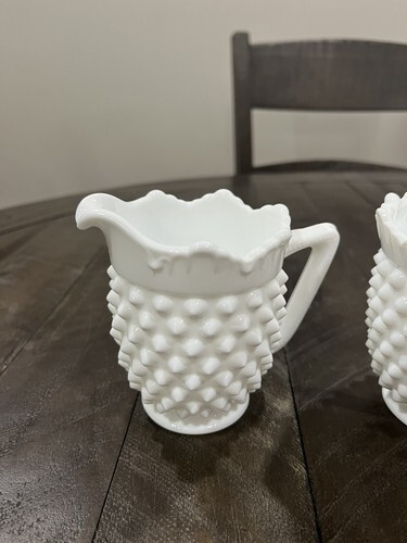 This Fenton Milk Glass Hobnail Creamer/Sugar Set Heavy-5441 is a beautiful addition to any collection. The handcrafted details showcase the exquisite craftsmanship of Fenton and the United States. The white milk glass and hobnail design provide a classic and timeless look that is sure to impress. The set is in great condition with no chips or cracks. This collectible is perfect for display or for use as a creamer/sugar set. The California Prop 65 Warning is not applicable for this item. Add this stunning Fenton piece to your collection today.