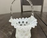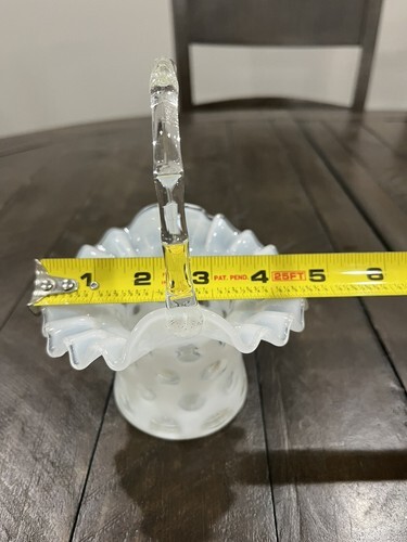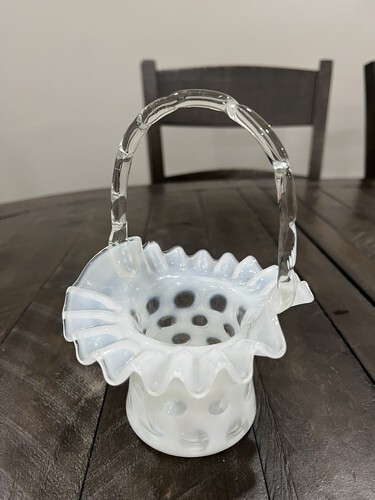 - Fenton Opalescent Coin Dot Basket with Clear Handle White No Chips/cracks