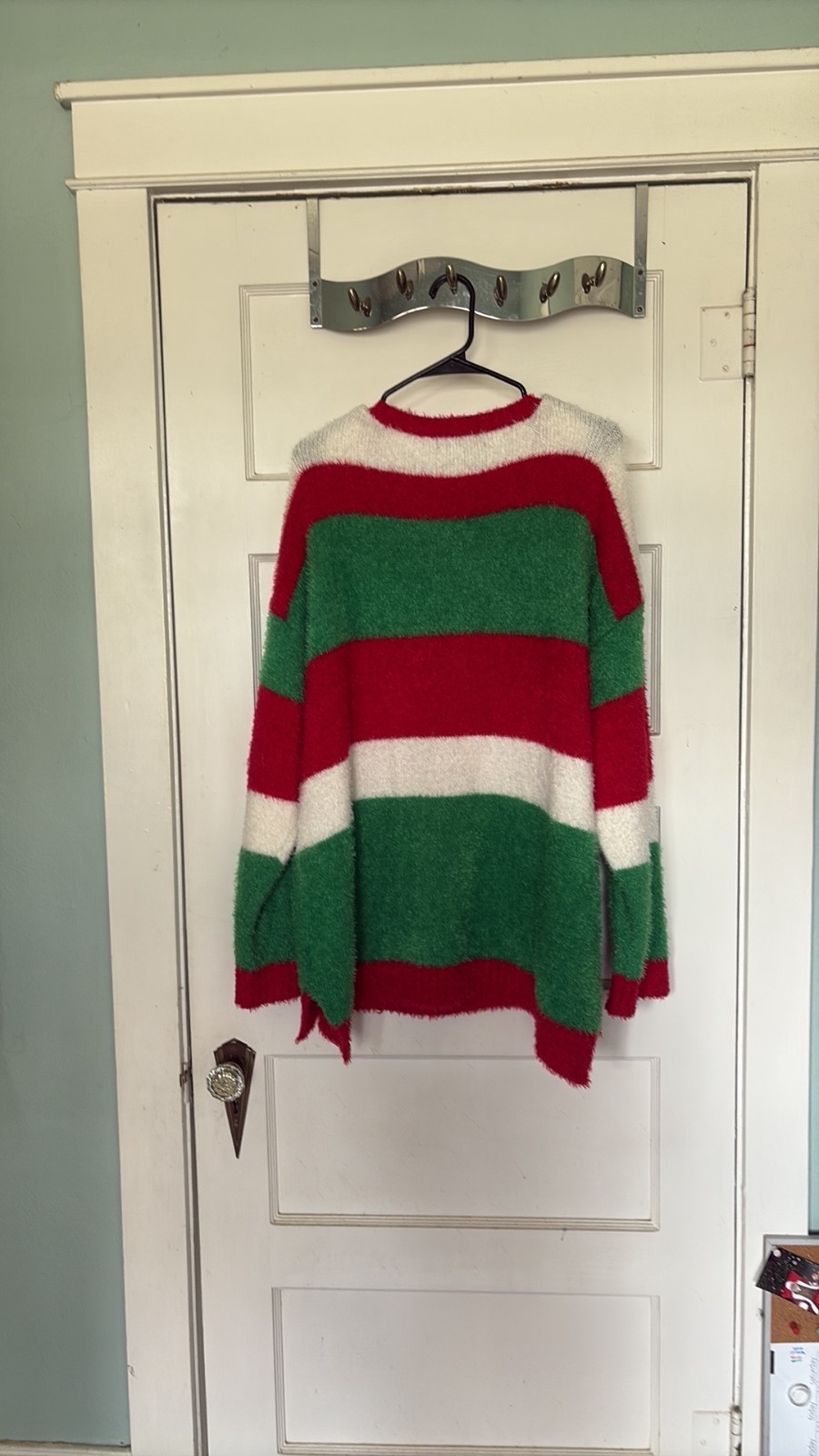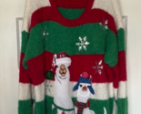 Festive Green and Red Sweater with Holiday Llamas Design Size 2X. Celebrate the season with this cozy sweater featuring a playful llama design. Perfect for adding a touch of holiday cheer to your wardrobe. Armpit to armpit measures 29?. Shoulder to hem is 29?. Sleeves measure 22? from the top of the shoulder seam to hem. Very Good Used Condition - See Photos for further description.