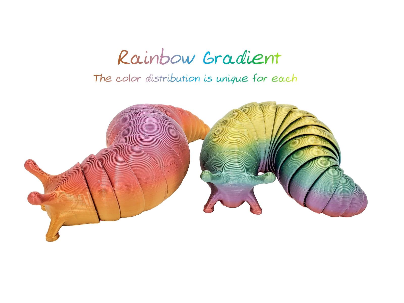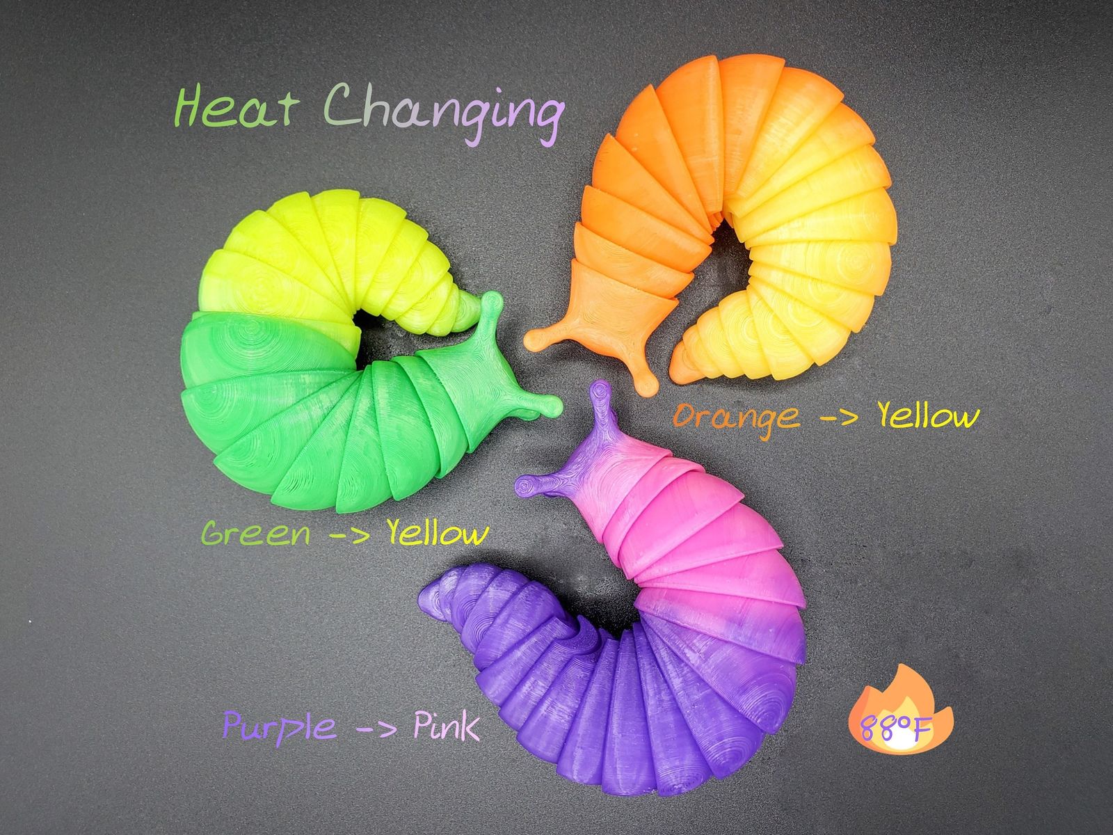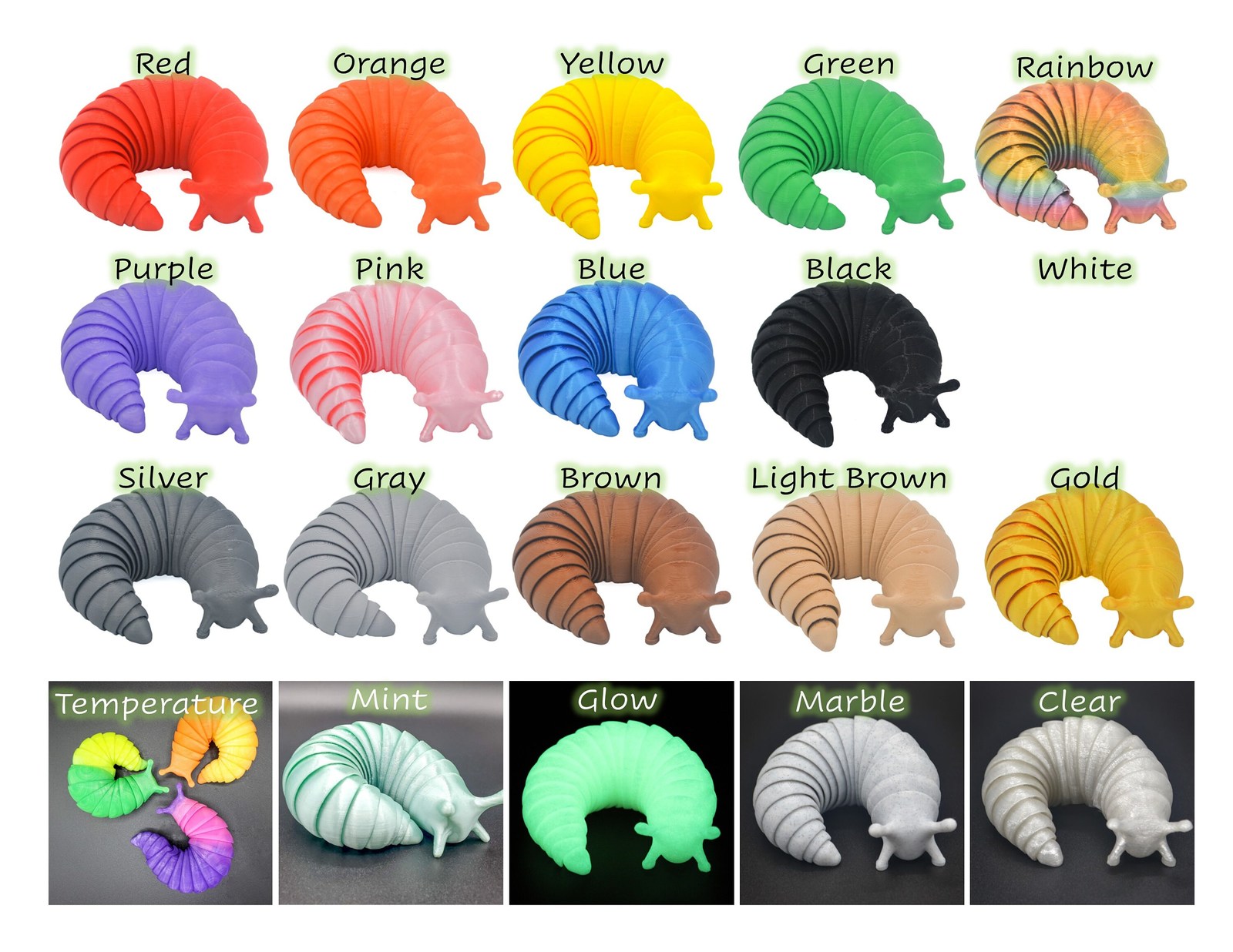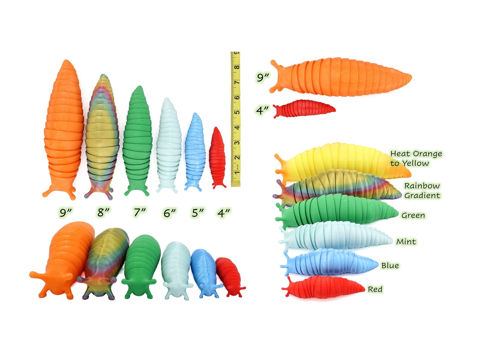 ? HUGE SELECTION OF COLORS AND SIZES! Choose from any color including specialty types like glow in the dark, temperature changing, rainbow, etc. Also choose from 6 different sizes ranging from baby (4") to JUMBO (9")! **NOTE: The detail and durability increases proportionally with the size of the slug. In other words any of the larger slugs articulate much better than the 4" size. The slugs in the video are 6". The color changing occurs around 87 degrees for our three temperature changing varieties which means sometimes hands alone are not warm enough to active the new color especially on cold days, try warm water or cuddling. The rainbow gradient is a shiny silk color that gradually changes color between two to three colors randomly. If you have a preference let us know and we will do our best to make a couple until we get one as close as we can to your taste.